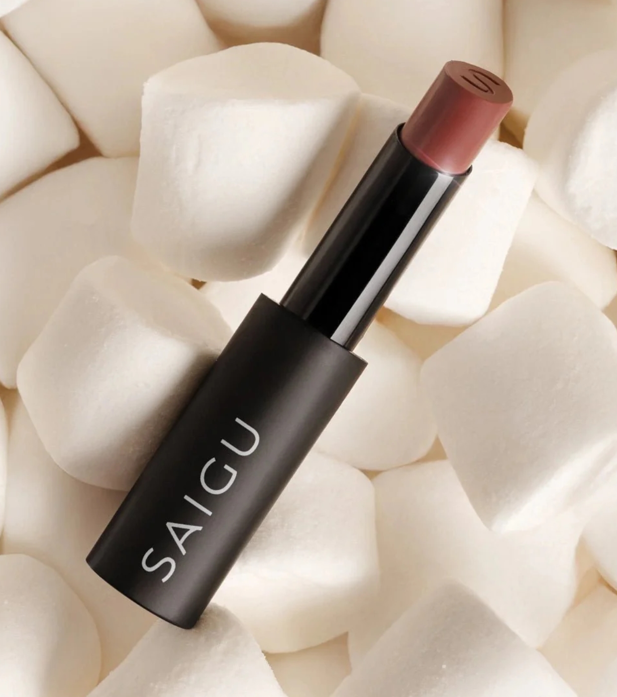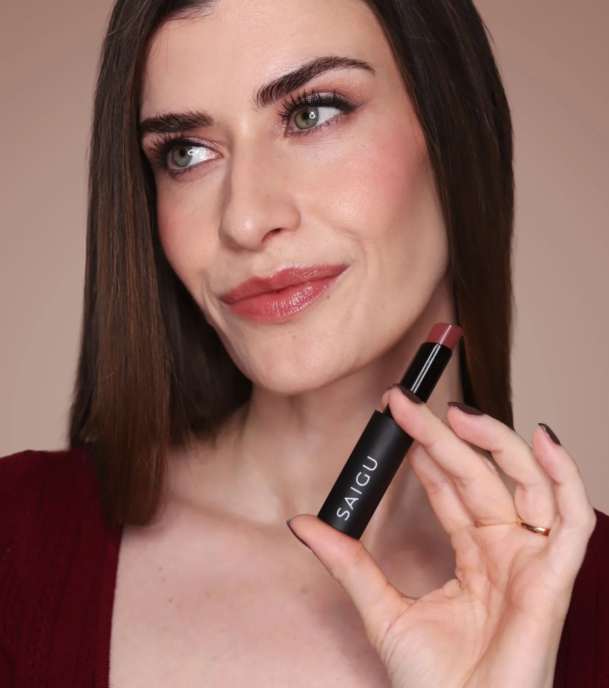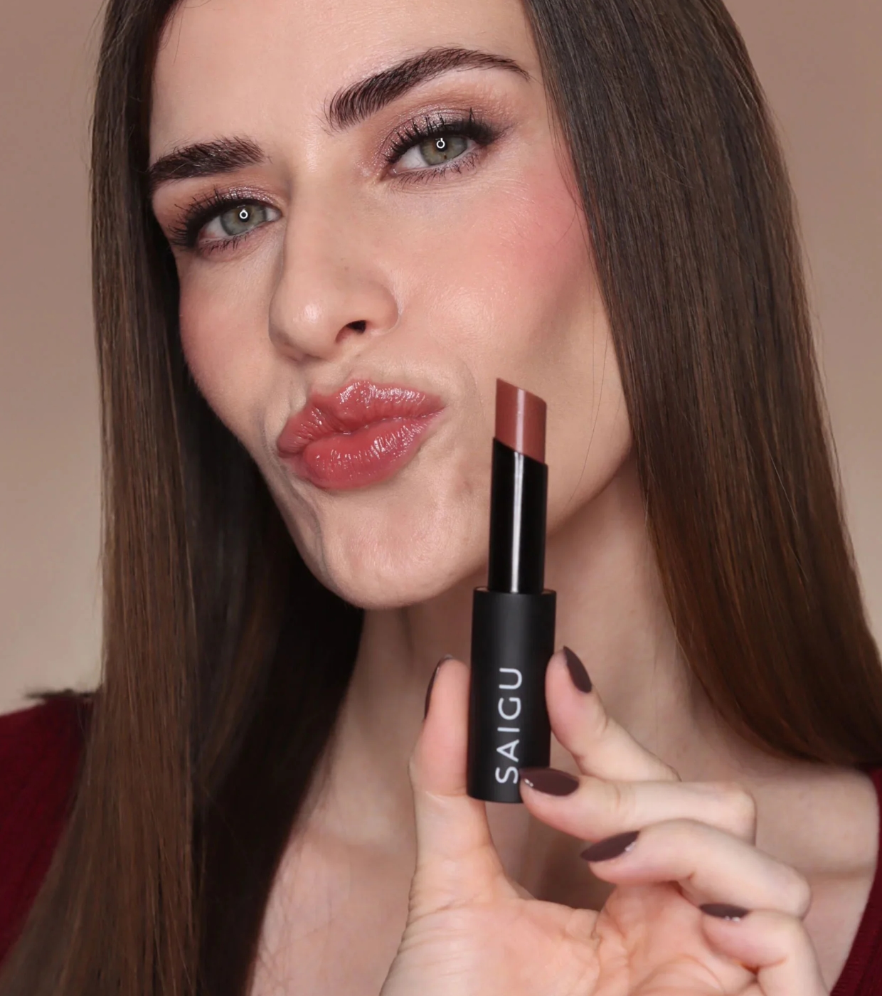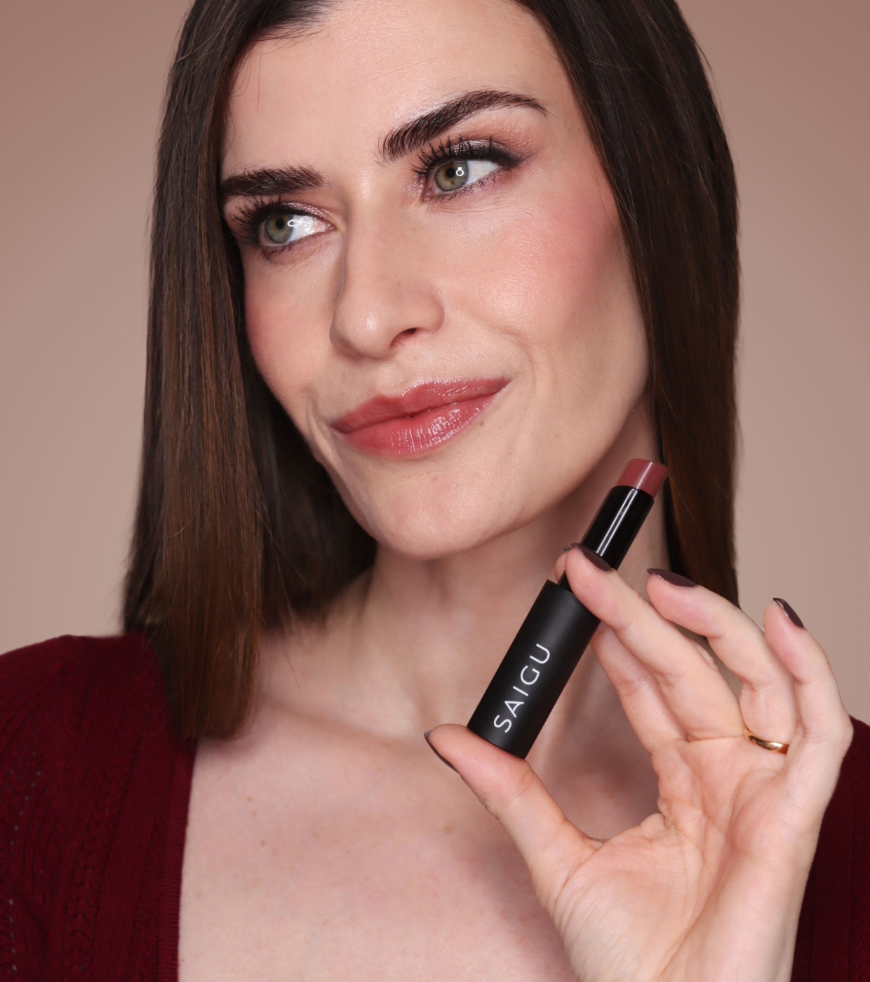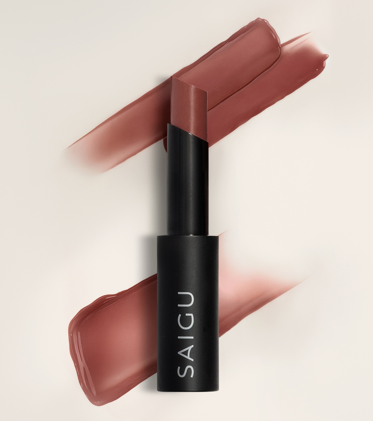 Der Melting Glow Lipstick von Saigu Cosmetics vereint Lippenpflege und Farbe in einem Lippenstift mit einem leuchtenden und natürlichen Finish.