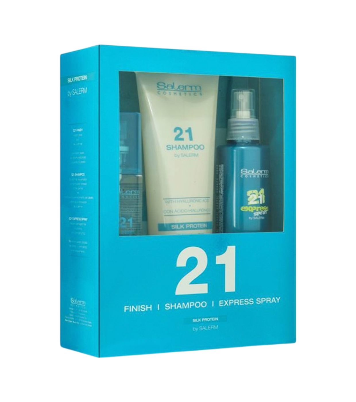 - 1x Salerm 21 Shampoo (mit Hyaluronsäure): Reinigt sanft und pflegt, repariert und revitalisiert das Haar. Angereichert mit Seidenproteinen, Vitamin E und Panthenol stärkt es die Haarfasern, verdichtet das Haar und spendet Feuchtigkeit von der Wurzel an.