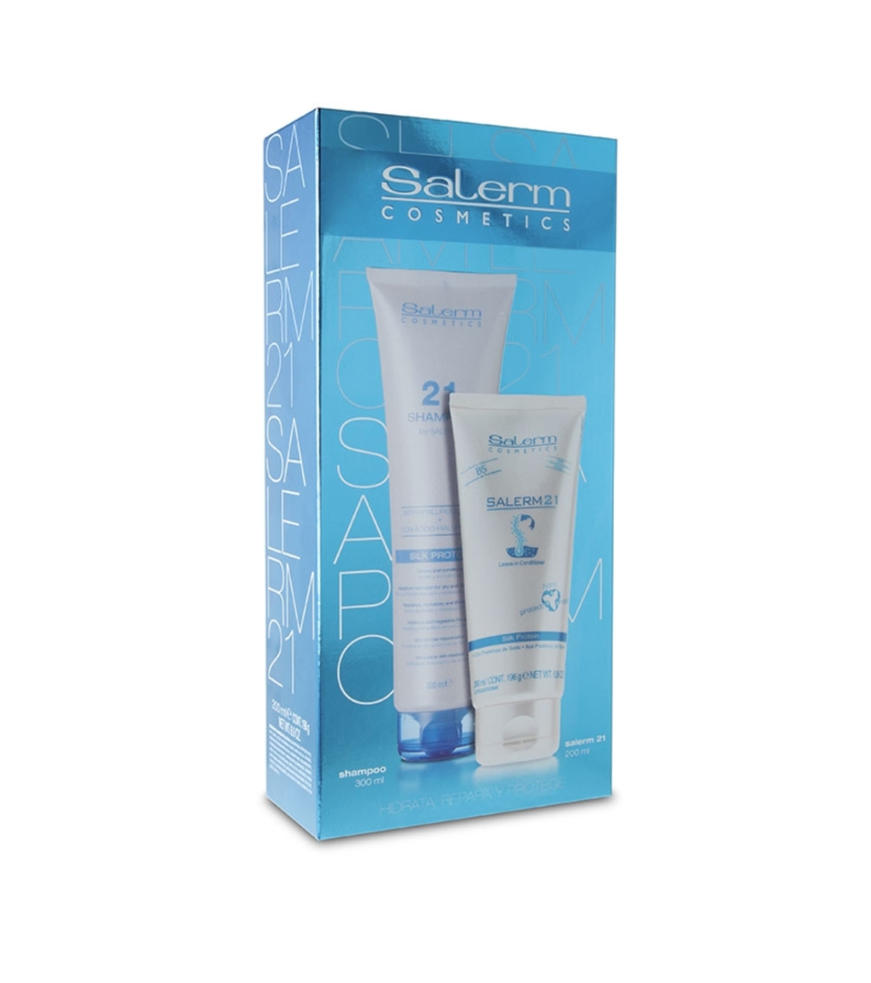 Pflegen Sie Ihr Haar vom Ansatz bis in die Spitzen mit dem Shampoo + Conditioner-Paket Salerm 21 , das speziell für trockenes, geschädigtes, poröses oder chemisch behandeltes Haar entwickelt wurde.