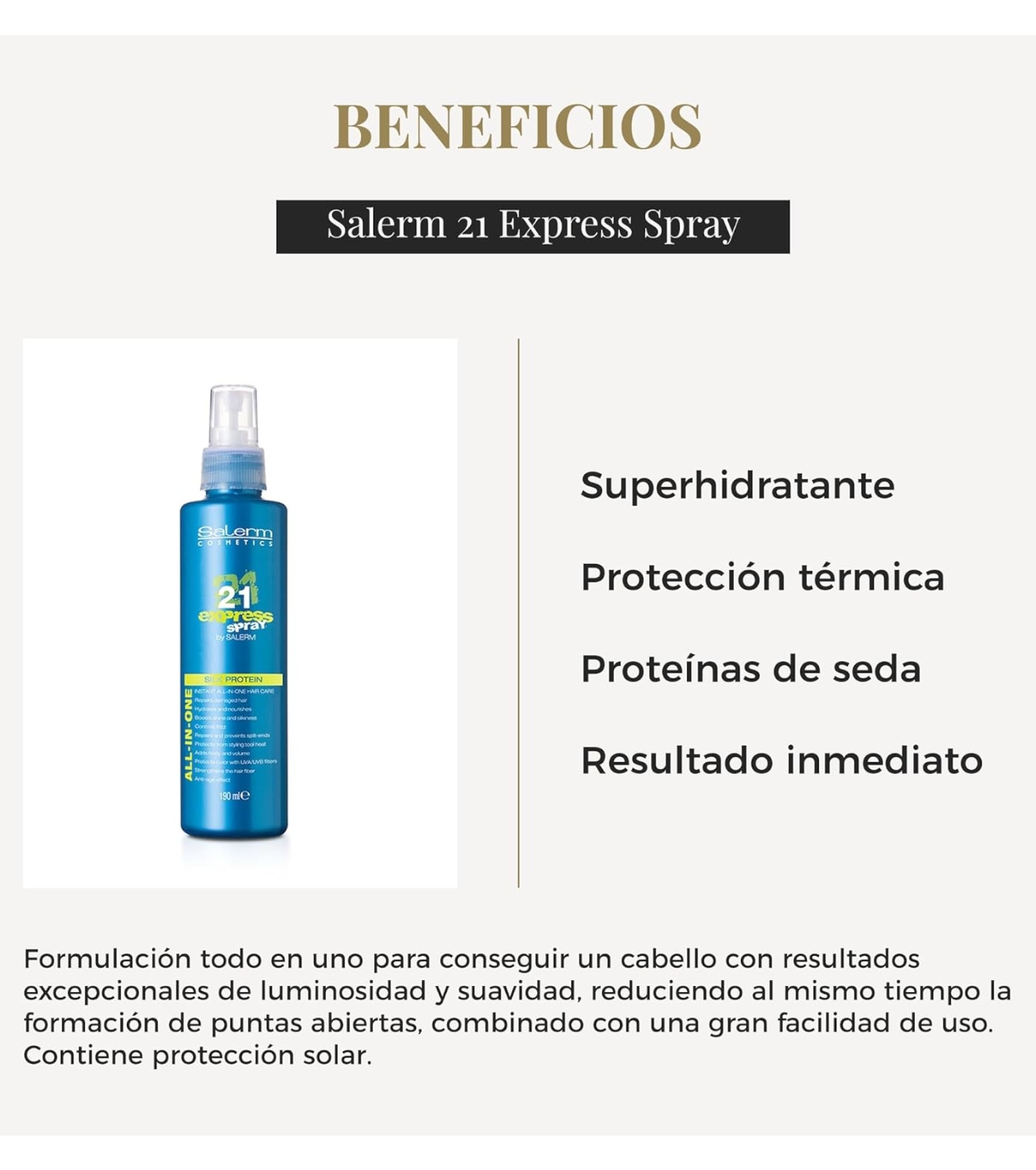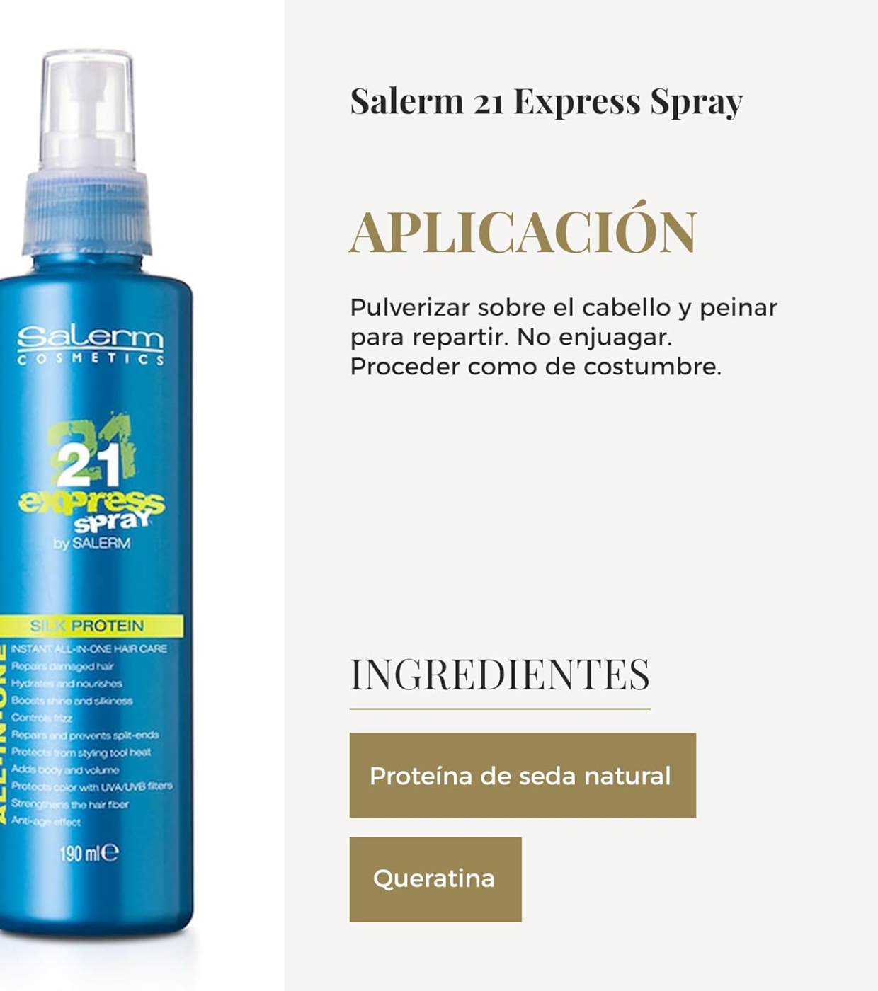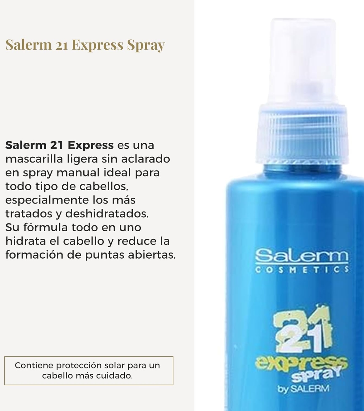 Freuen Sie sich in Sekundenschnelle über weiches, glänzendes und geschütztes Haar mit Salerm 21 Express von Salerm , der Leave-in-Maske im Sprayformat, die intensive Feuchtigkeitsversorgung und sofortige Ergebnisse bietet.