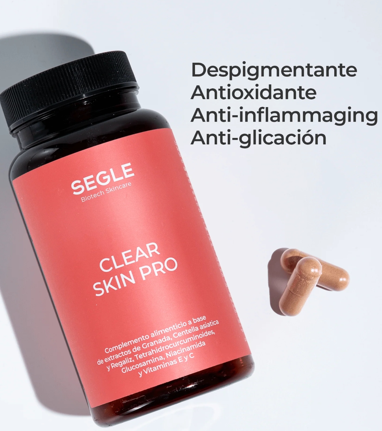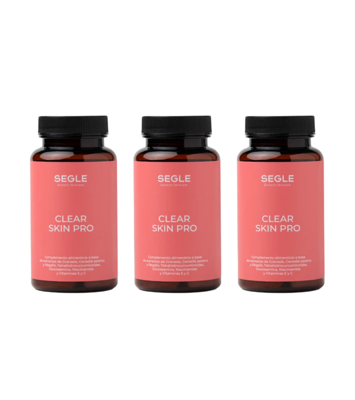 Entdecken Sie dieses Set aus 3 Clear Skin Pro Nahrungsergänzungsmitteln von Segle, das depigmentierend und antioxidativ wirkt und die Gesundheit von Haut und Gelenken mit einer umfassenden Anti-Flecken-, Anti-Aging-, antioxidativen und entzündungshemmenden Wirkung verbessert.