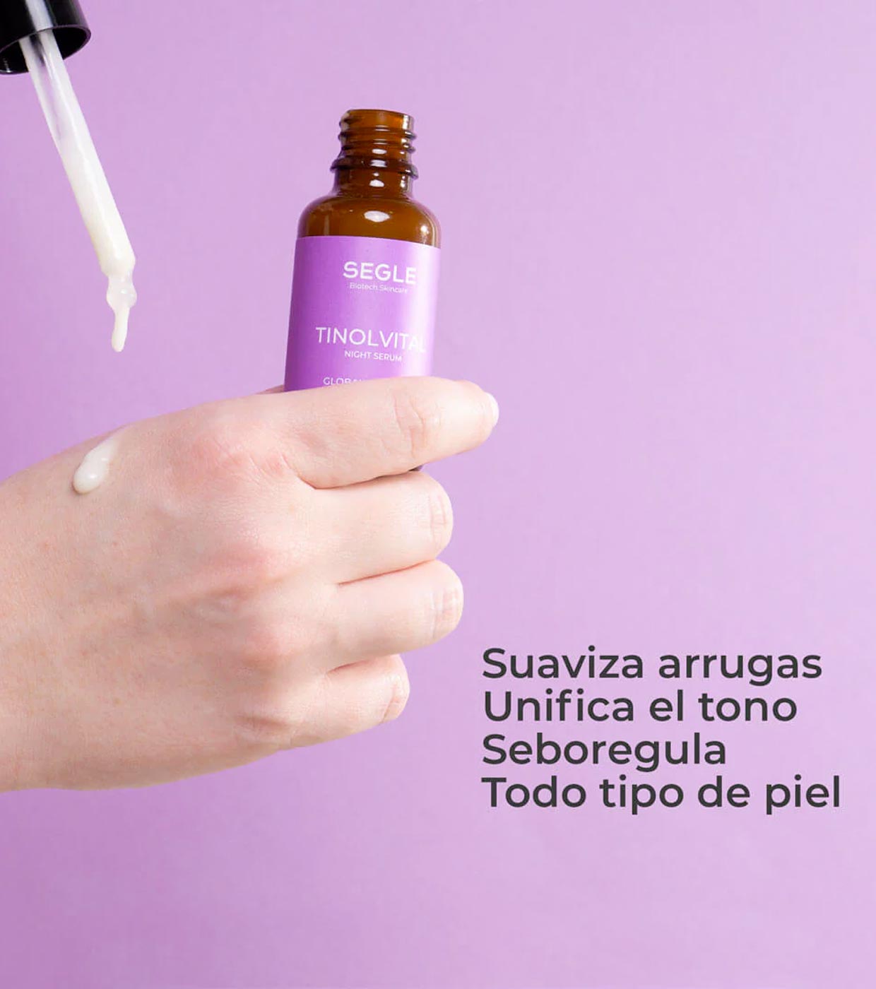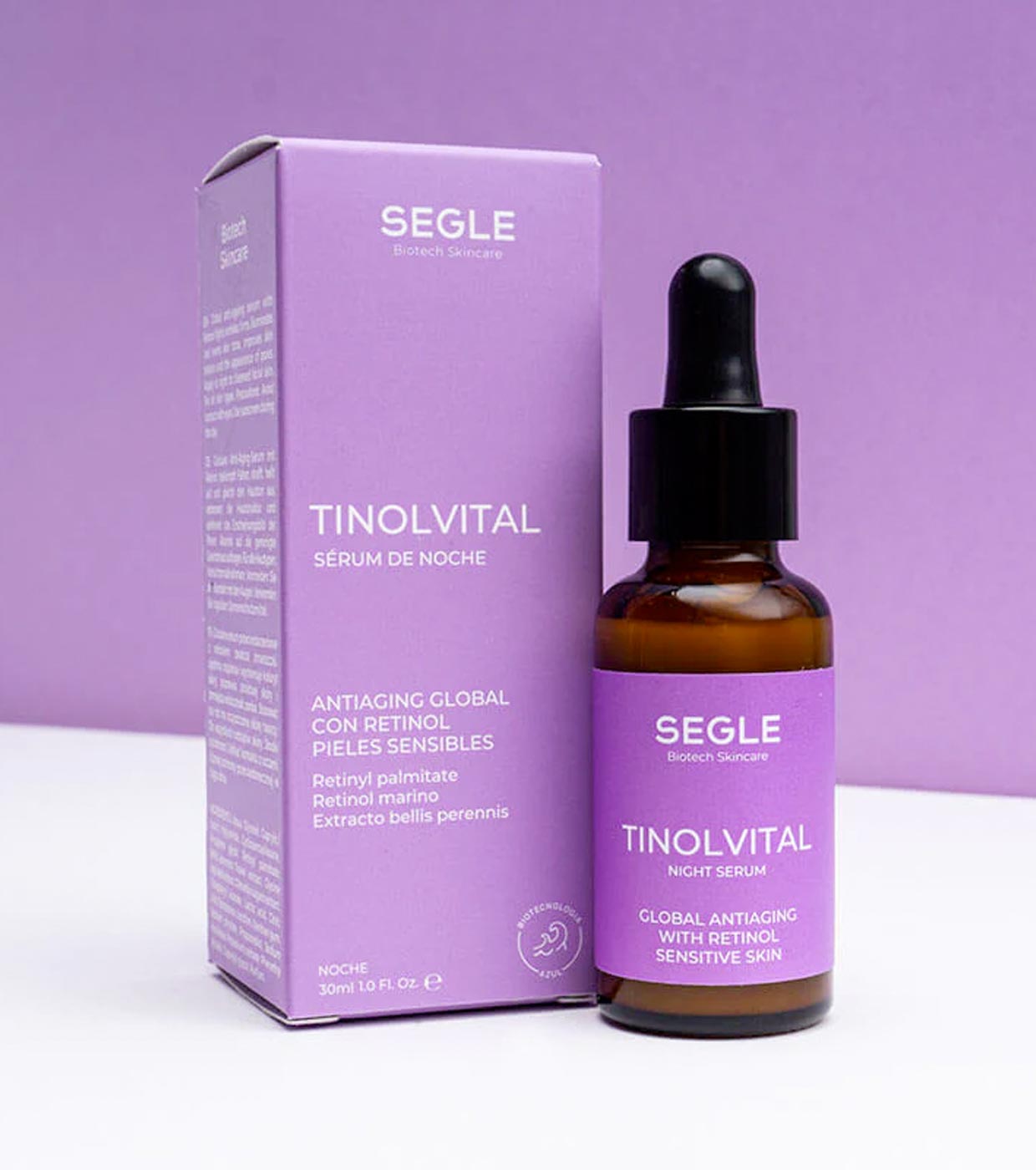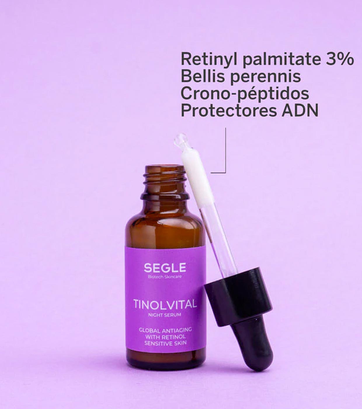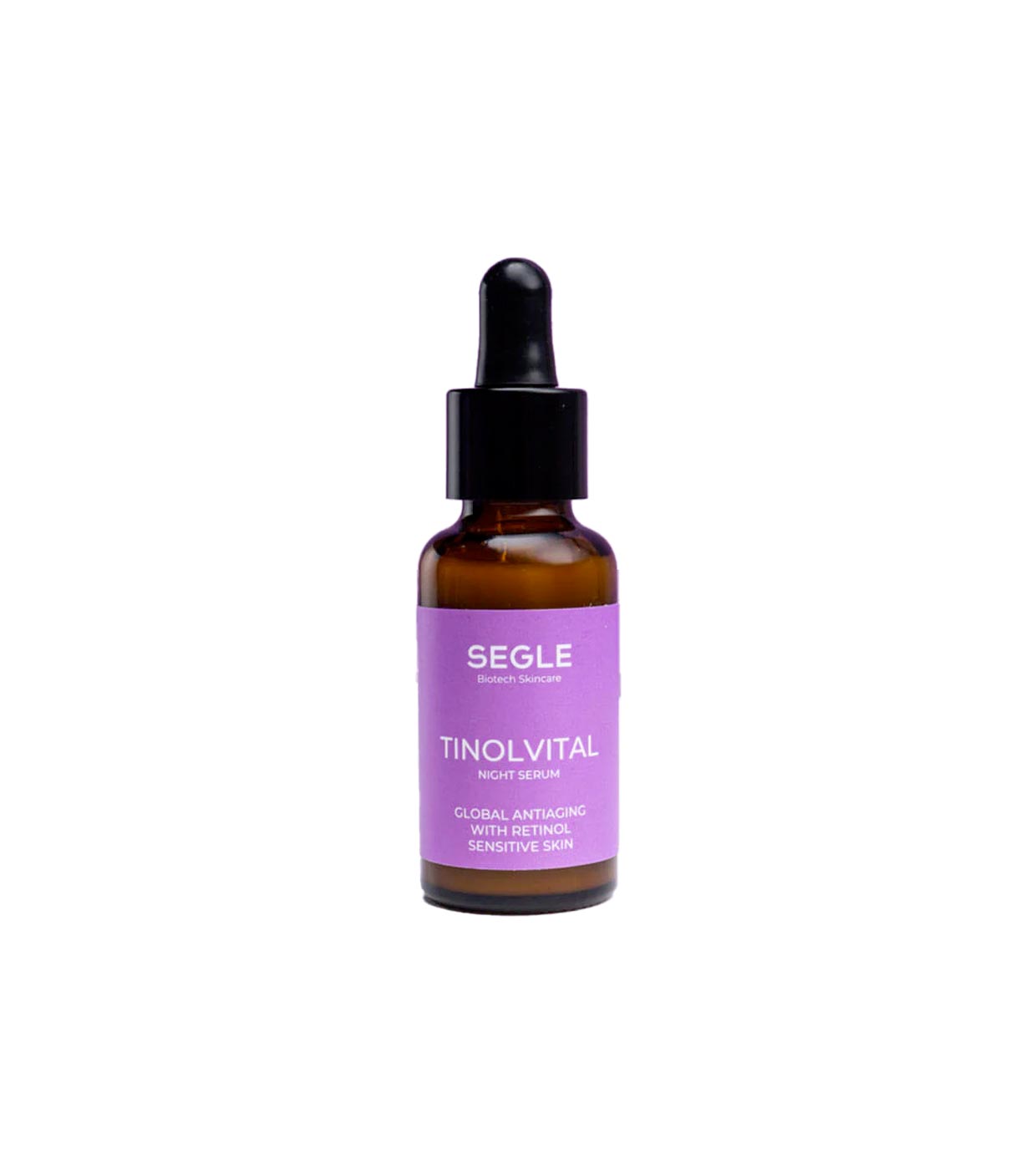 Das Tinolvital Nachtserum von SEGLE ist ein Nachtserum mit Retinol (3 % Retinylpalmitat) + 1 % marines Retinol, das wirksam alle Zeichen der Hautalterung bekämpft.