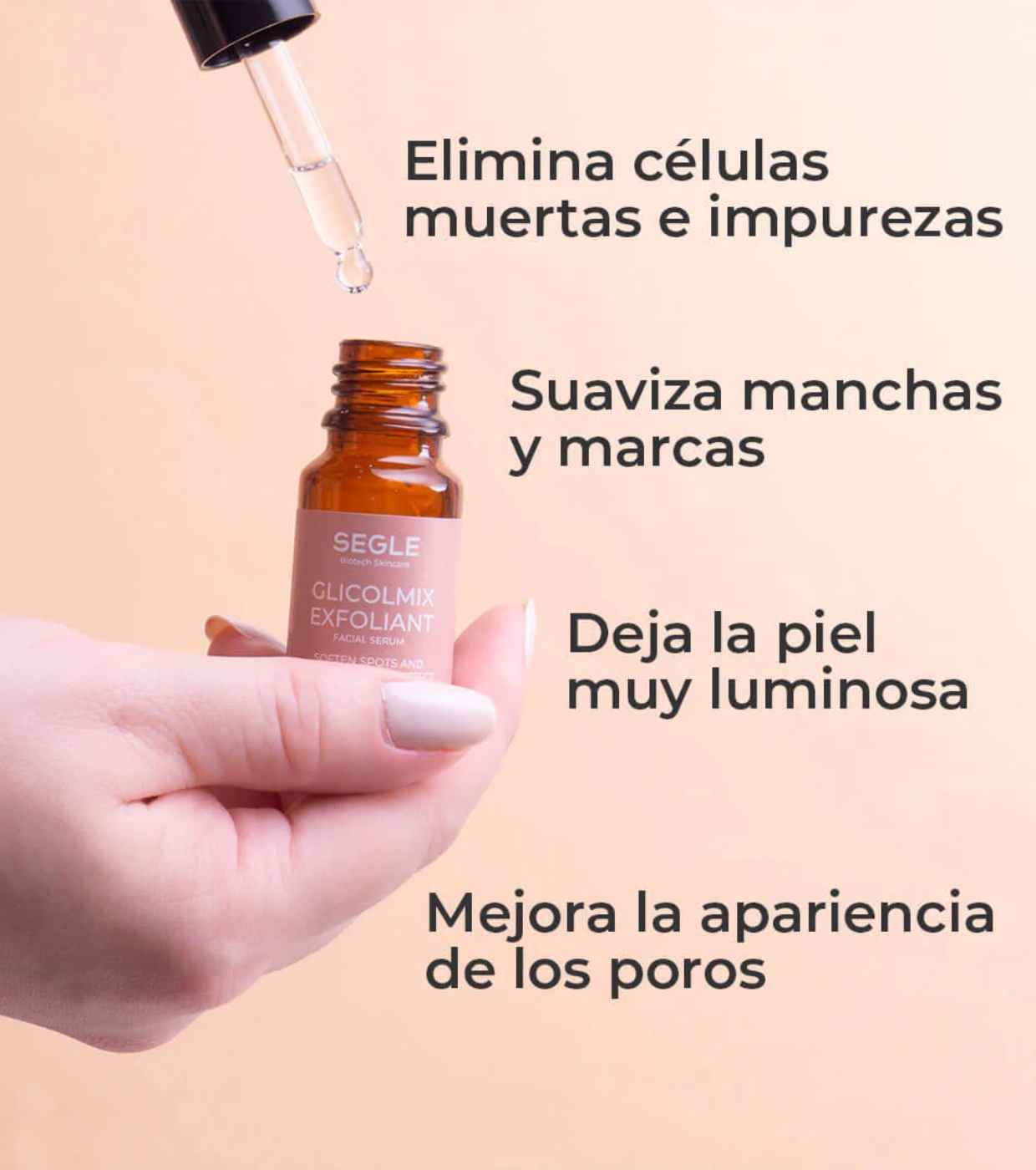- Glicolmix: erneuerndes Peeling. Verbessert die Textur und gleicht den Hautton aus (an 2 Abenden pro Woche anwenden).