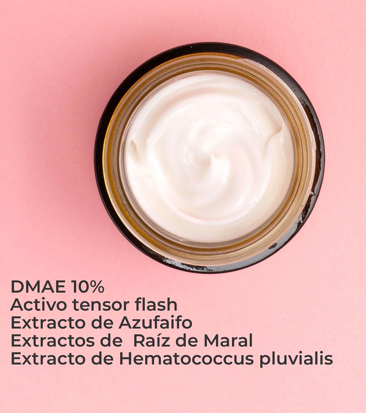Seine Wirkstoffe wie DMAE mit antioxidativer, feuchtigkeitsspendender und tonisierender Wirkung oder Heamatococcus-Algenextrakt, der den Abbau von Kollagenfasern verhindert, schaffen es, die Haut von innen zu reorganisieren und zu straffen.