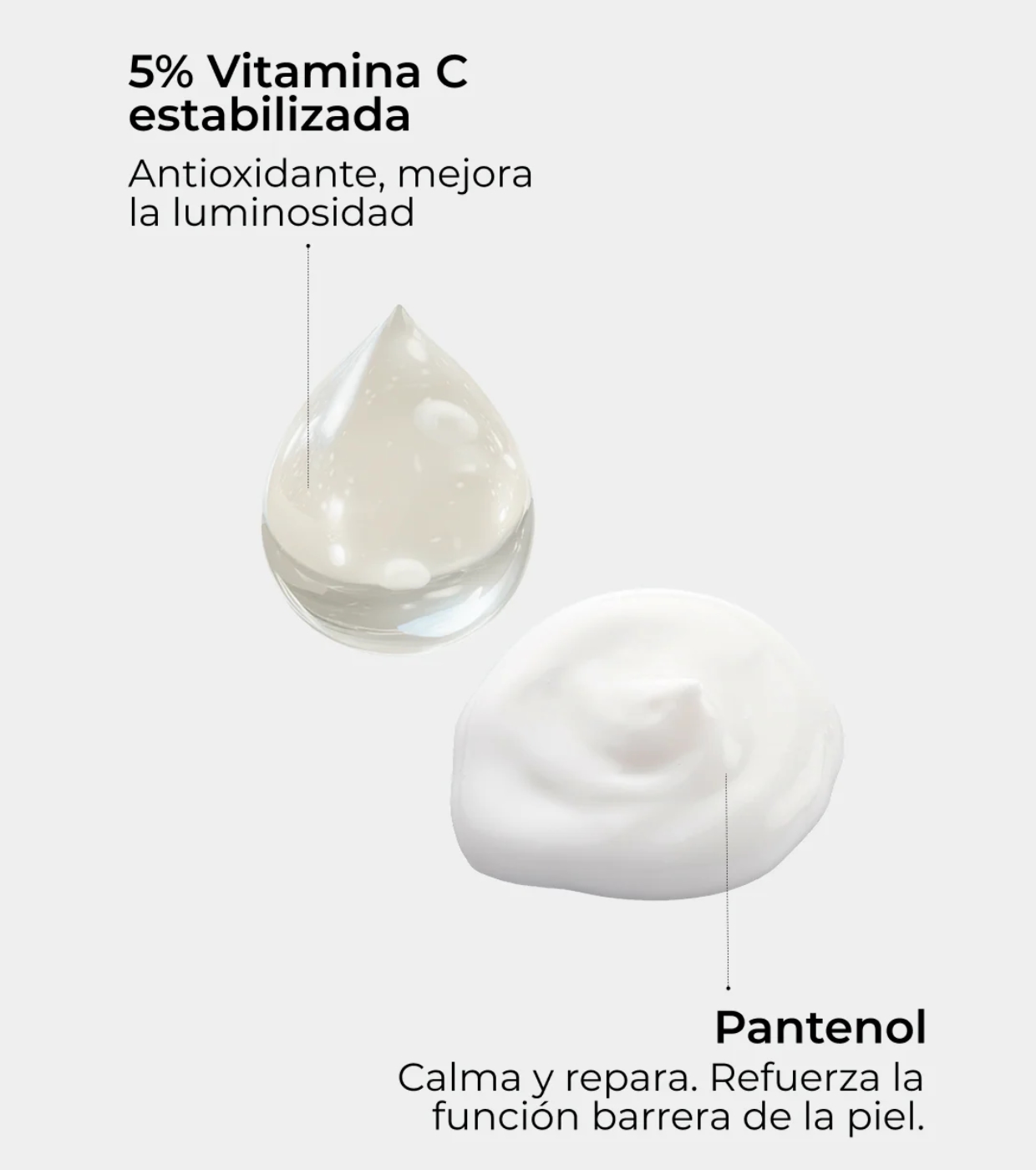 - Stabilisiertes Vitamin C hellt dunkle Flecken auf und gleicht einen ungleichmäßigen Hautton aus.