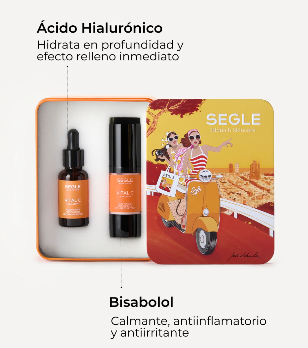Beleben Sie Ihr Gesicht mit dem Vital C Pack von Segle , einer kompletten antioxidativen und aufhellenden Lösung, die in einer exklusiven Limited Edition präsentiert wird, illustriert von Jordi Labanda.