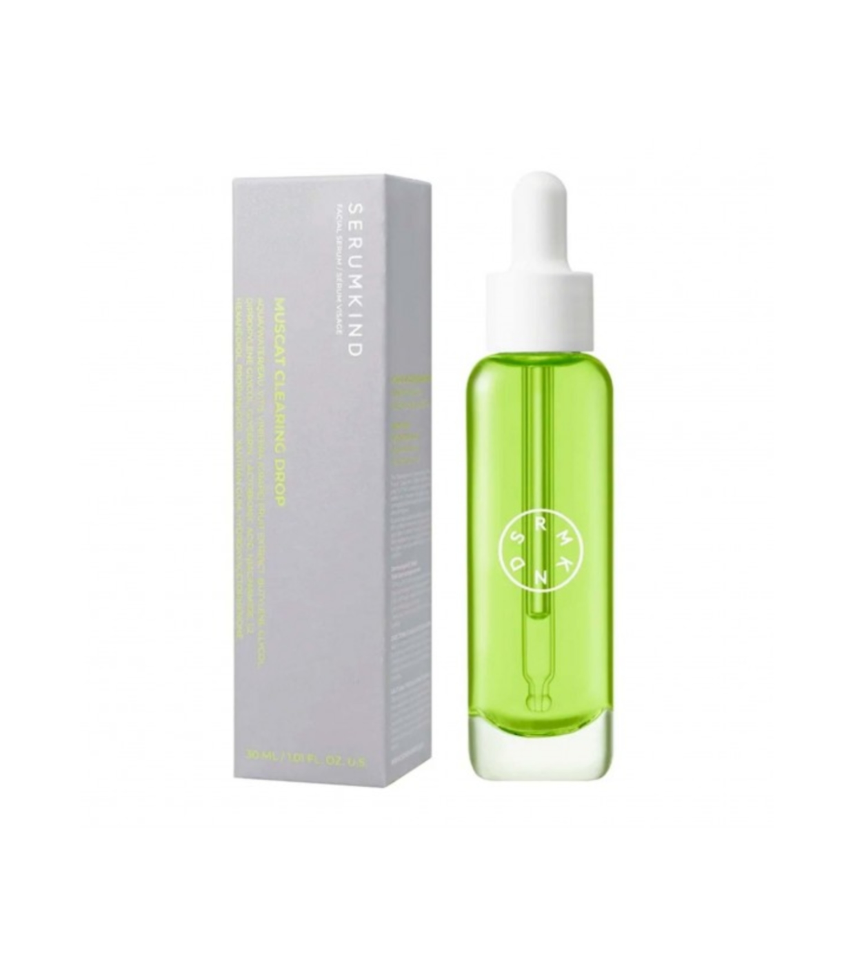 Anti-Unreinheiten-Gesichtsserum Muscat Clearing Drop von Serumkind , formuliert mit Muskat-Traubenextrakt, Niacinamid und PHA für zu Akne und/oder zu Unreinheiten neigende Haut. Hilft, die Haut zu beruhigen und ihre Textur zu verbessern, indem sie den Ton vereinheitlicht.