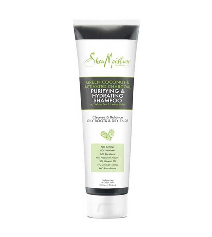 Reinigendes und feuchtigkeitsspendendes Shampoo mit grüner Kokosnuss und Aktivkohle von Shea Moisture, ideal zum Reinigen und Entfernen von überschüssigem Öl und Produktrückständen.