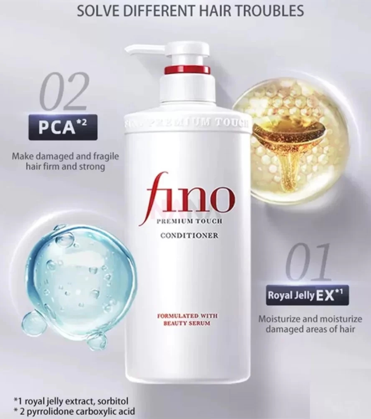 Es ist mit Gelée Royale-Extrakt, PCA (Parachloramphetamin) und Weizenprotein angereichert, um das Haar mit Feuchtigkeit zu versorgen und zu stärken, was zu einer weichen und schönen Mähne führt.