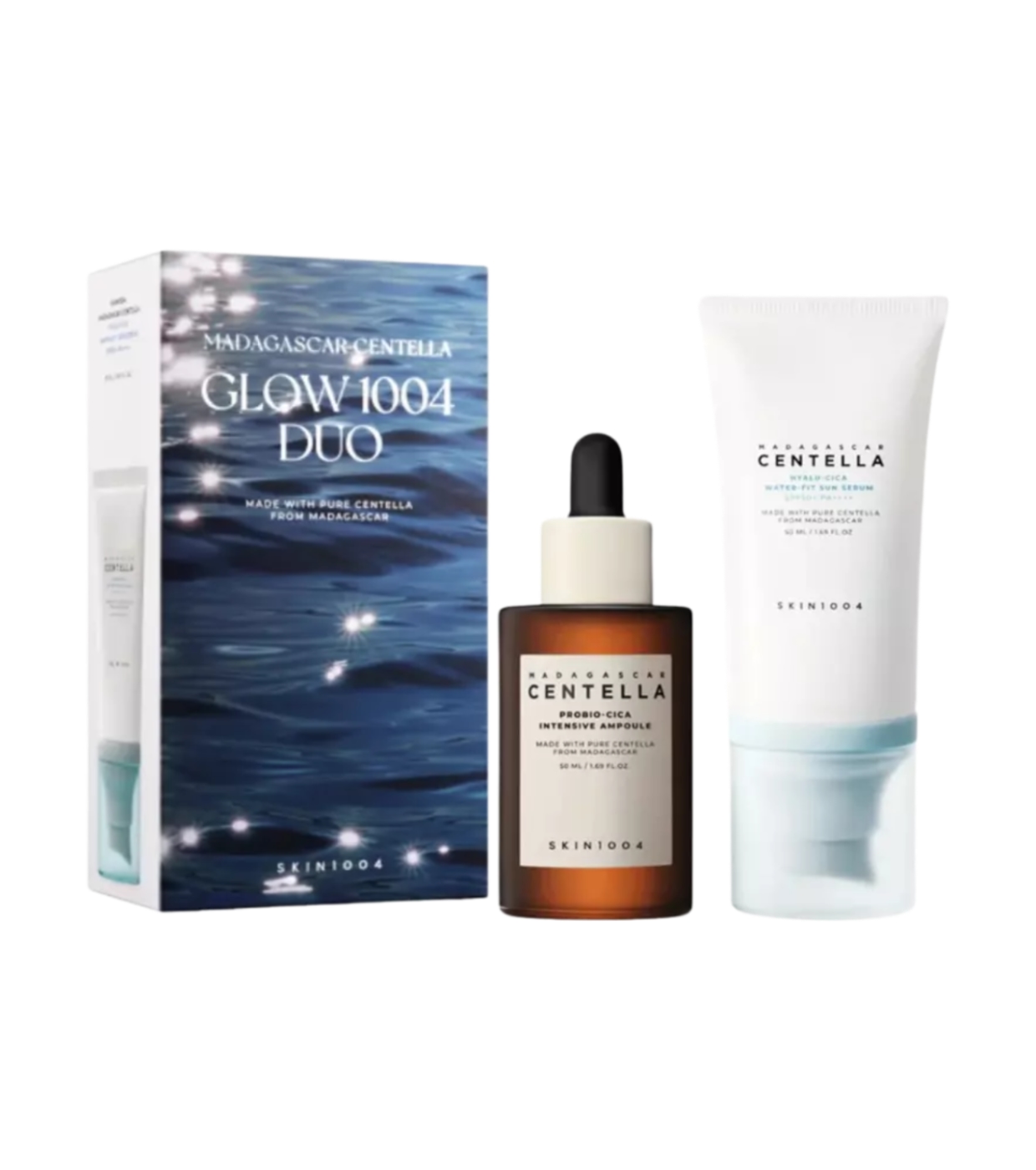 - 1 x Madagascar Centella Hyalu-Cica Water-Fit Sun Serum SPF50+ PA++++ (50 ml): Sonnenschutzserum für den täglichen Gebrauch, das einen hohen Schutz vor UV-Strahlen bietet und dank seines Hyaluronsäuregehalts die Haut mit Feuchtigkeit versorgt und erfrischt.