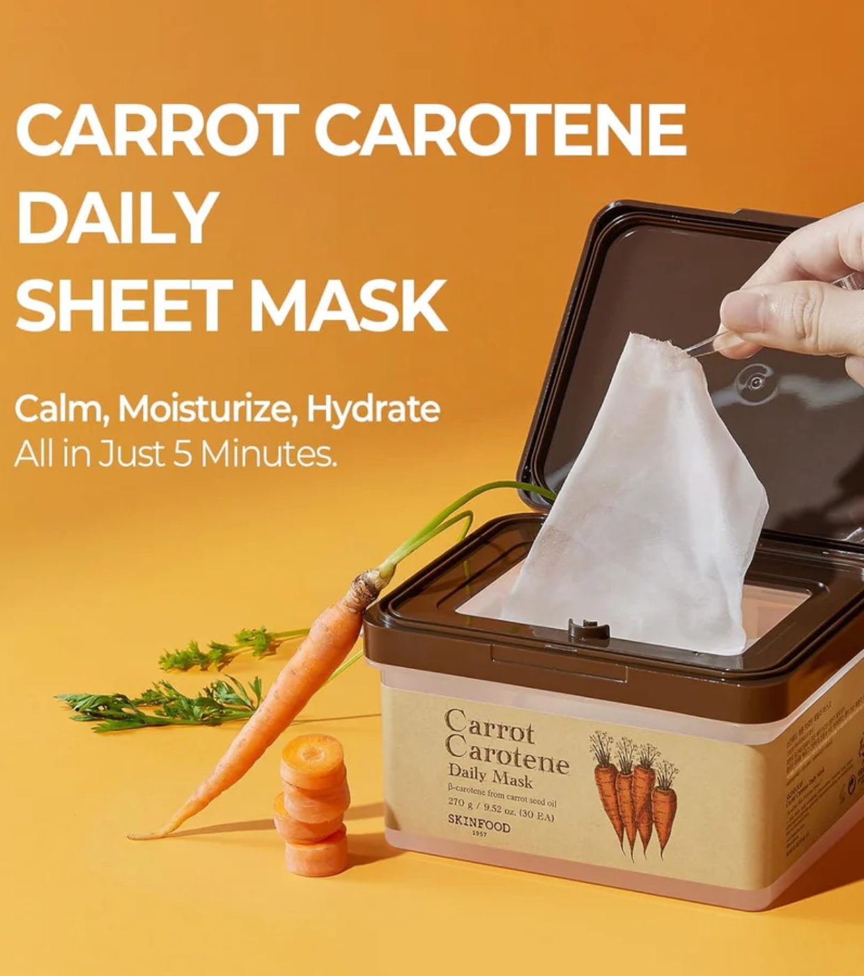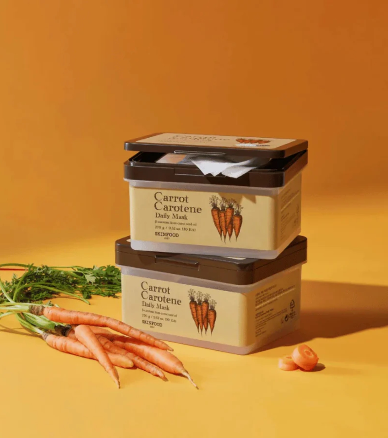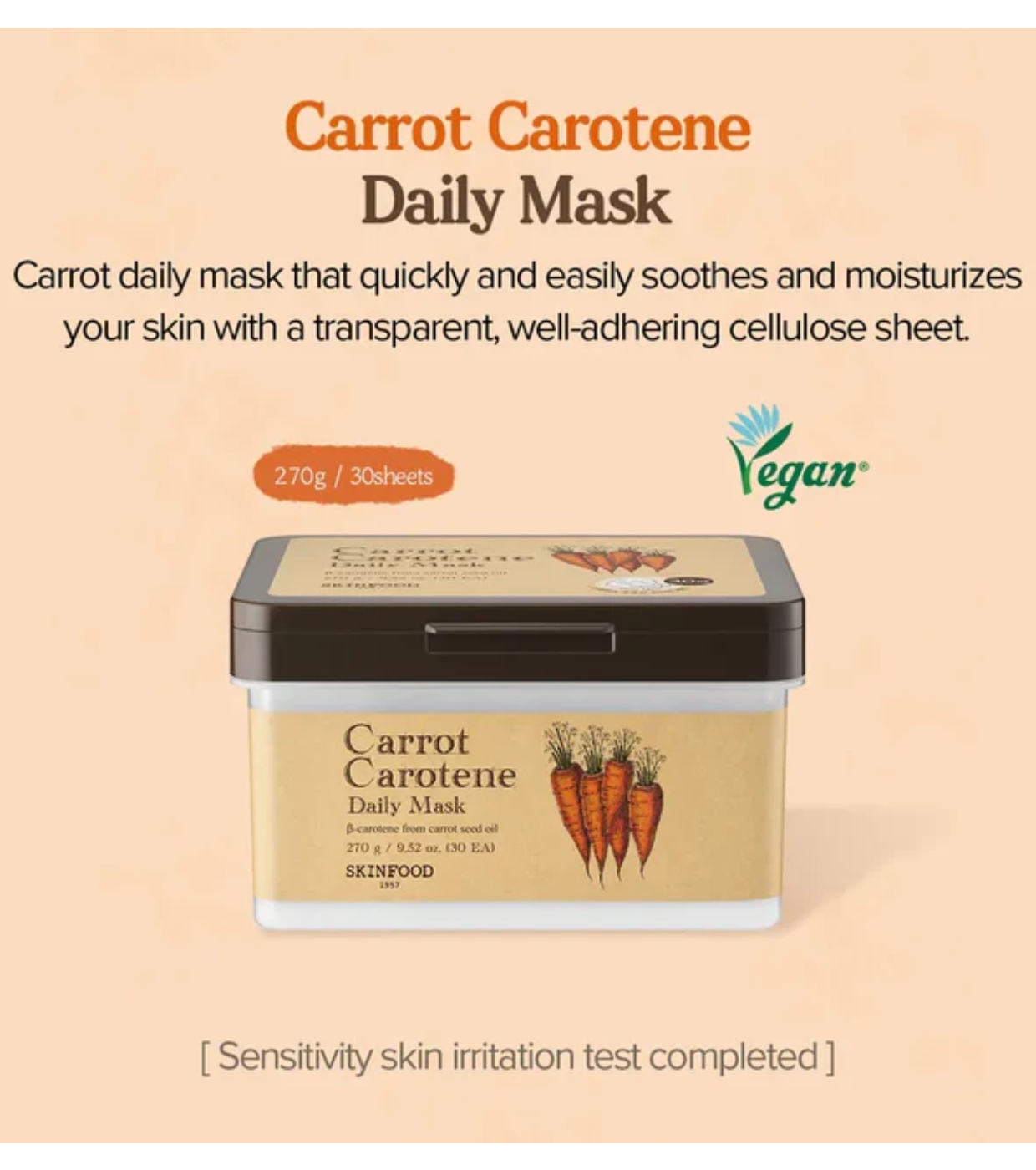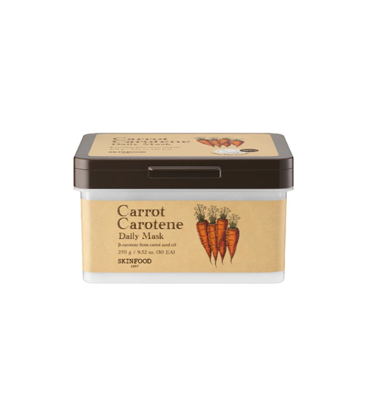 Carrot Carotene Skinfood Die tägliche Maske enthält Bio-Karottenextrakt, der reich an Beta-Carotin (Karotin) und natürlichen Antioxidantien ist, die gestresste und fahle Haut beruhigen, mit Feuchtigkeit versorgen und revitalisieren.