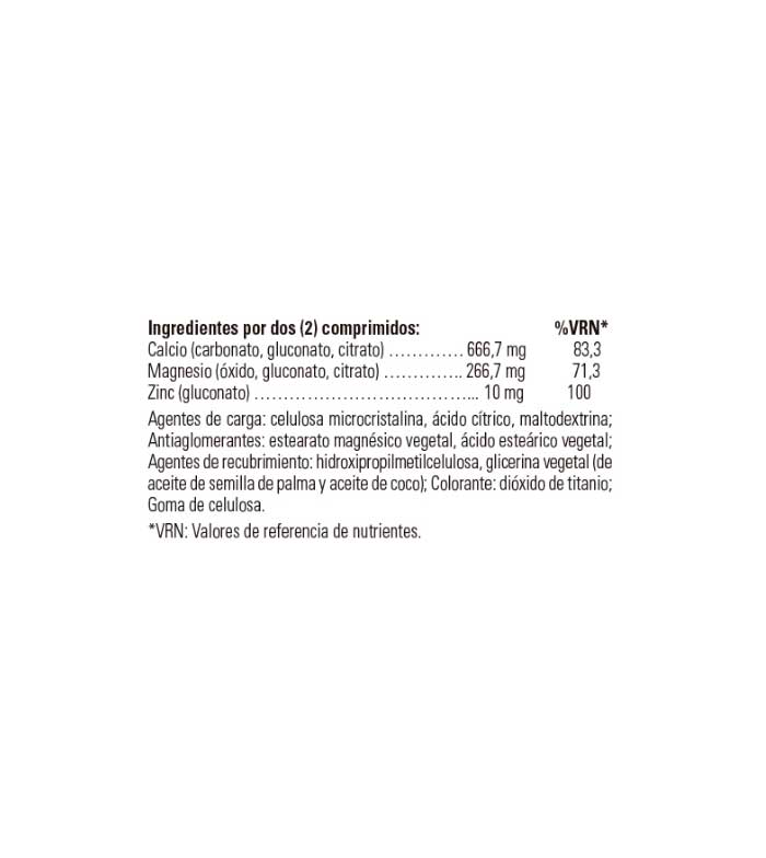Calcio (carbonato, gluconato, citrato), Magnesio (óxido, gluconato, citrato), Zinc (gluconato). Agentes de carga: celulosa microcristalina, ácido cítrico, maltodextrina; Antiaglomerantes: estearato magnésico vegetal, ácido esteárico vegetal; Agentes de recubrimiento: hidroxipropilmetilcelulosa, glicerina vegetal (de aceite de semilla de palma y aceite de coco); Colorante: dióxido de titanio; Goma de celulosa.