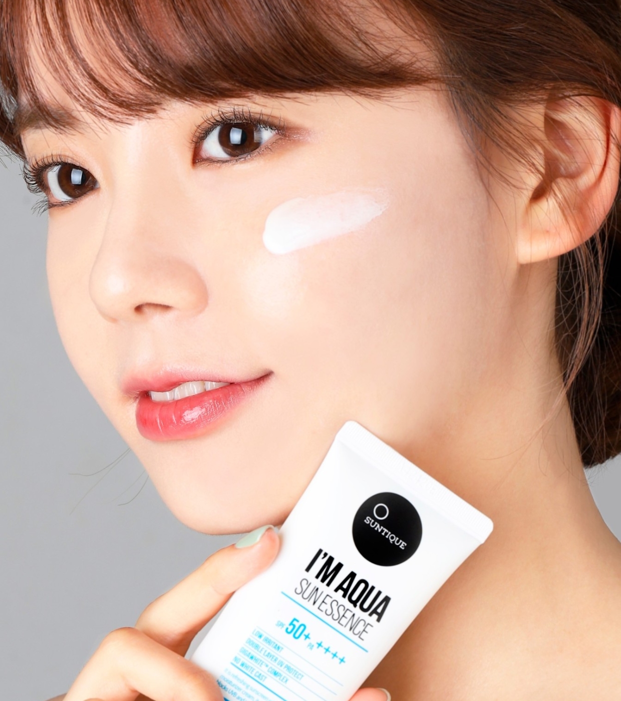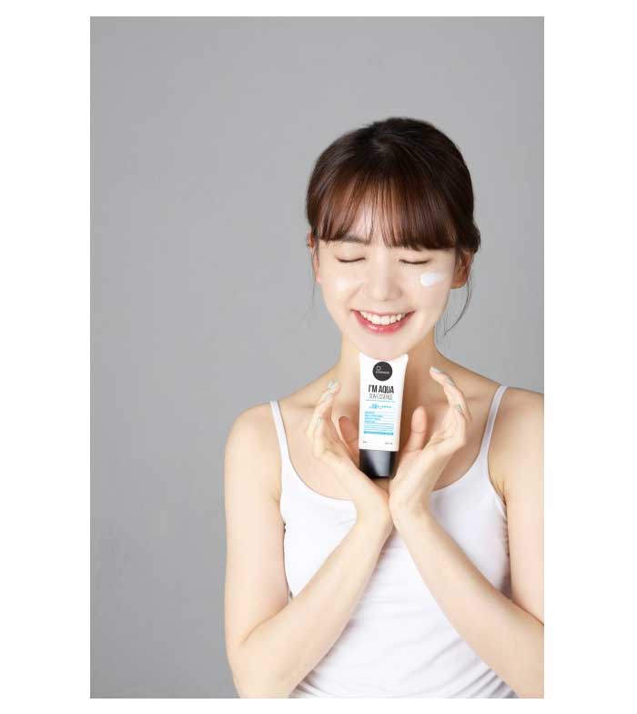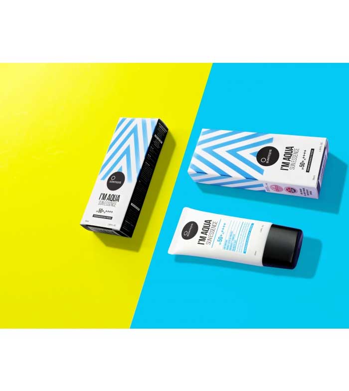 I'm Aqua Sun Essence von Suntique ist ein Sonnenschutz auf Wasserbasis SPF 50 + / PA ++++, formuliert mit entspannender Centella Asiatica und Aloe Vera.