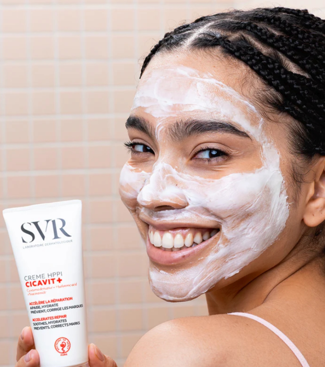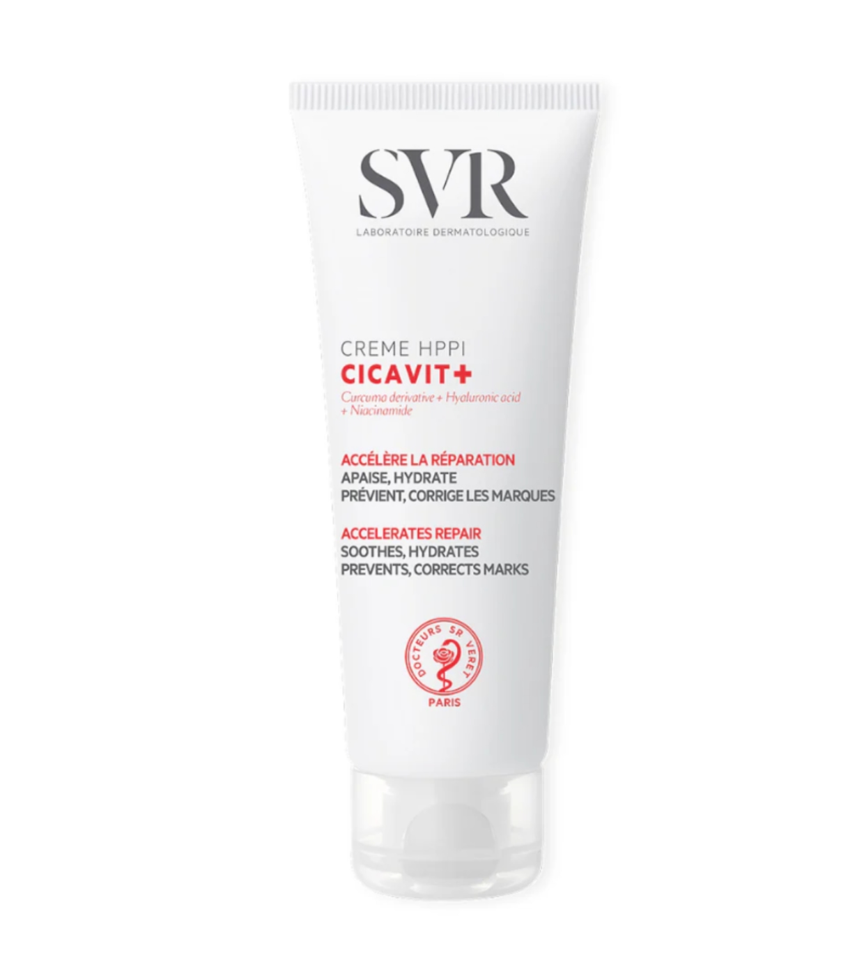 SVR Cicavit+ Cream wird als definitive Lösung für eine Vielzahl von Hautproblemen präsentiert, von Trockenheit und Rötung bis hin zu Windpockenflecken, Tätowierungen, postdermatologischen Eingriffen wie Peeling und Laser, Entzündungen, Sonnenbrand, Wachsen und Rasieren.