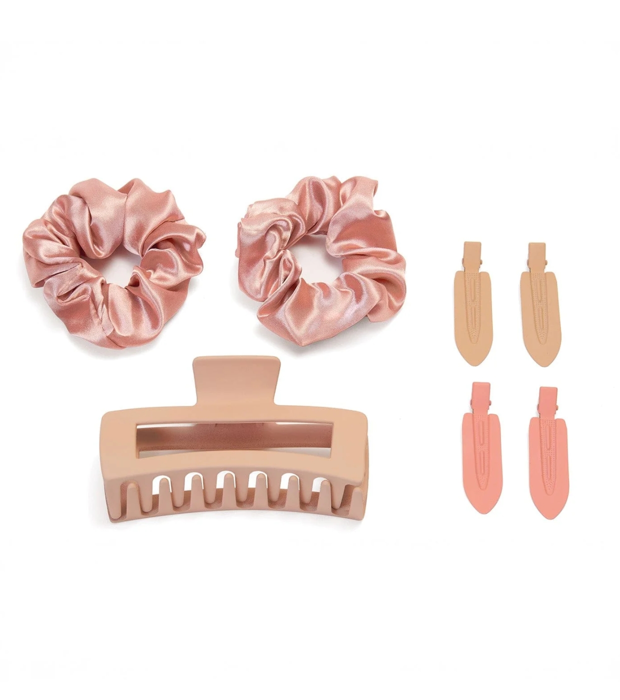 Es enthält eine stabile Krallenklammer, die sich perfekt für schnelle und elegante Hochsteckfrisuren eignet, Satin-Haargummis, die Ihr Haar pflegen und schützen, indem sie ein Ziehen verhindern, und nicht abfärbende Klammern, die sich ideal zum Festhalten Ihres Haares beim Schminken oder Stylen eignen.