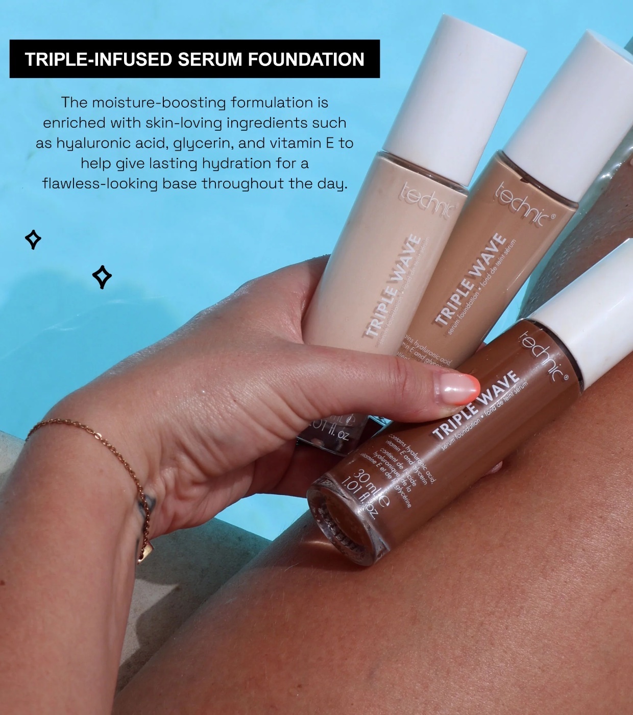 Erhalten Sie strahlende, hydratisierte Haut mit dieser leichten, nicht fettenden Triple Wave Serum Foundation von Technic Cosmetics .