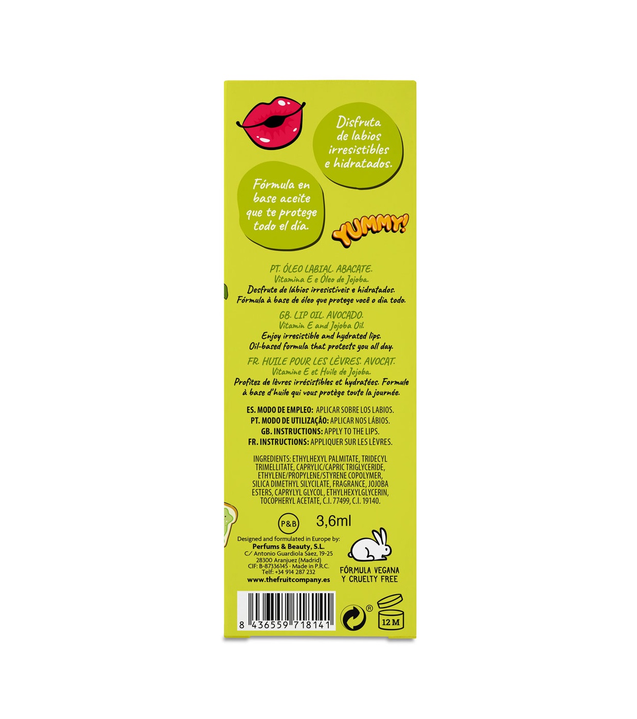 Das Avocado-Lippenöl von Fruit Company ist die perfekte Option, um Ihre Lippen den ganzen Tag über mit Feuchtigkeit zu versorgen und zu schützen.