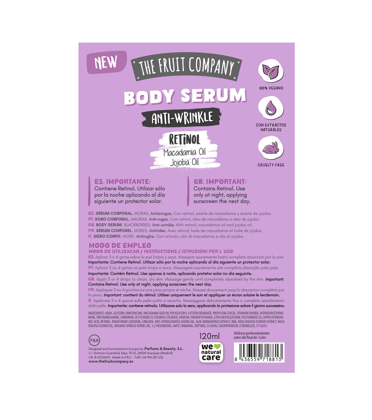 Verabschieden Sie sich von Falten und begrüßen Sie ein glatteres, strahlenderes Dekolleté mit dem speziellen Anti-Falten-Körperserum mit Brombeerduft für das Dekolleté von The Fruit Company.