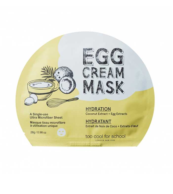 Die Egg Cream Mask Hydration von Too cool for school ist eine hochwirksame, nährende Gesichtsmaske, die mit Ei-Extrakt, Kokoswasser, Niacinamid und Pflanzenextrakten formuliert ist.
