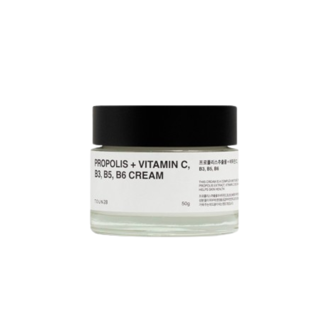 Propolis Vitamin C, B3, B5, B6 Cream von Toun28 ist eine Multivitamin-Gesichtscreme, die Propolis und einen Komplex aus essentiellen Vitaminen kombiniert, um die Haut zu revitalisieren, mit Feuchtigkeit zu versorgen und zu schützen.