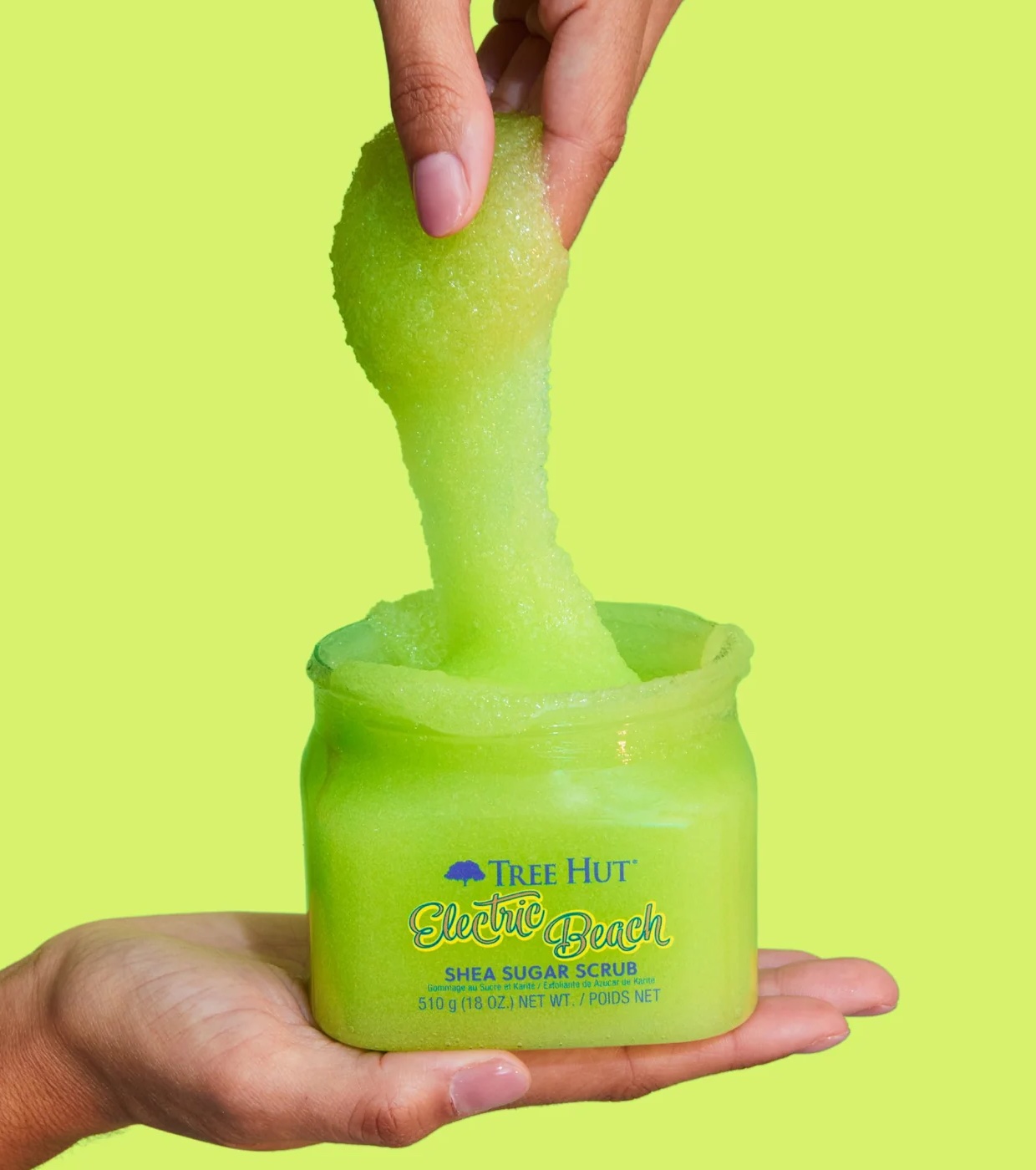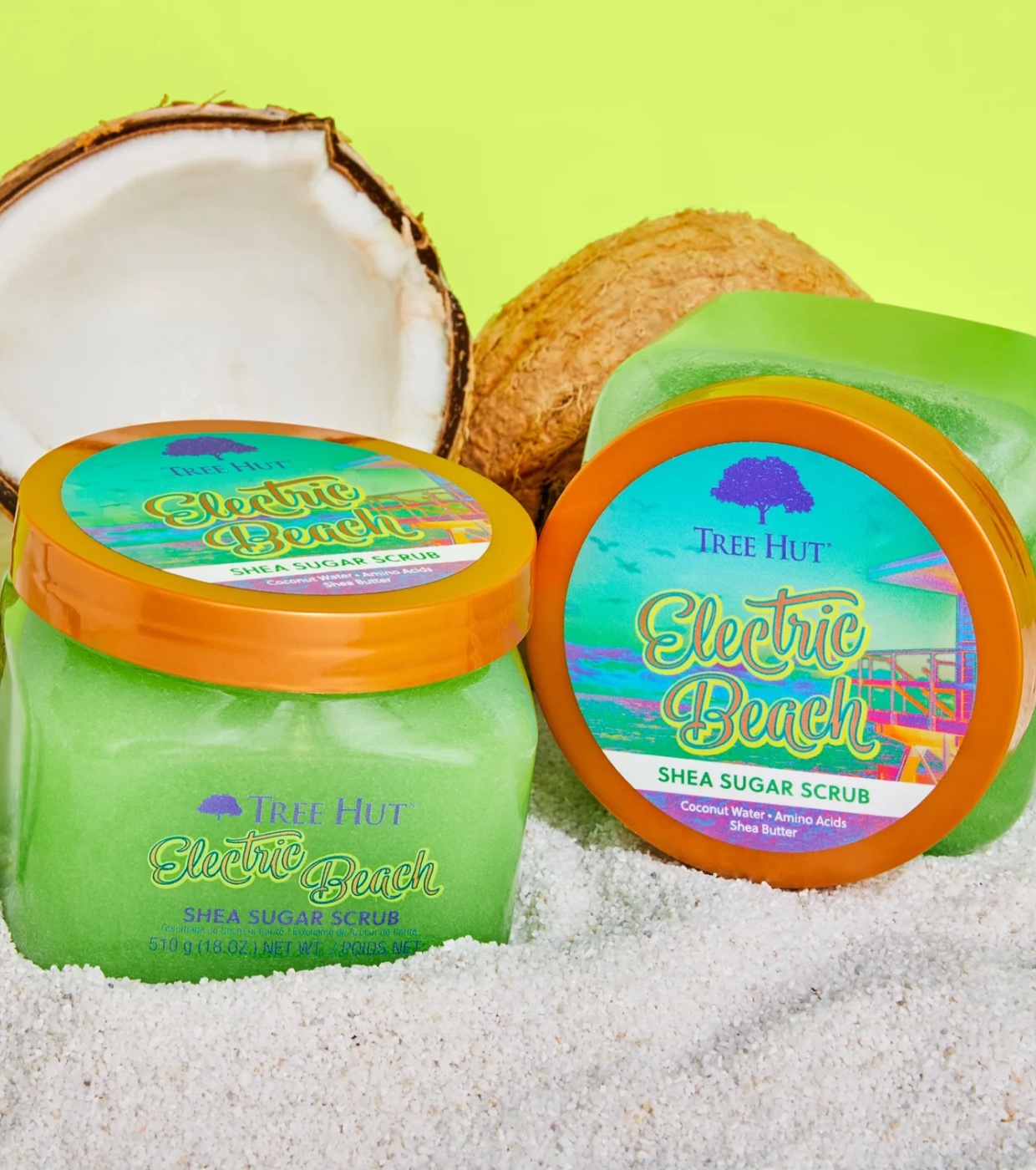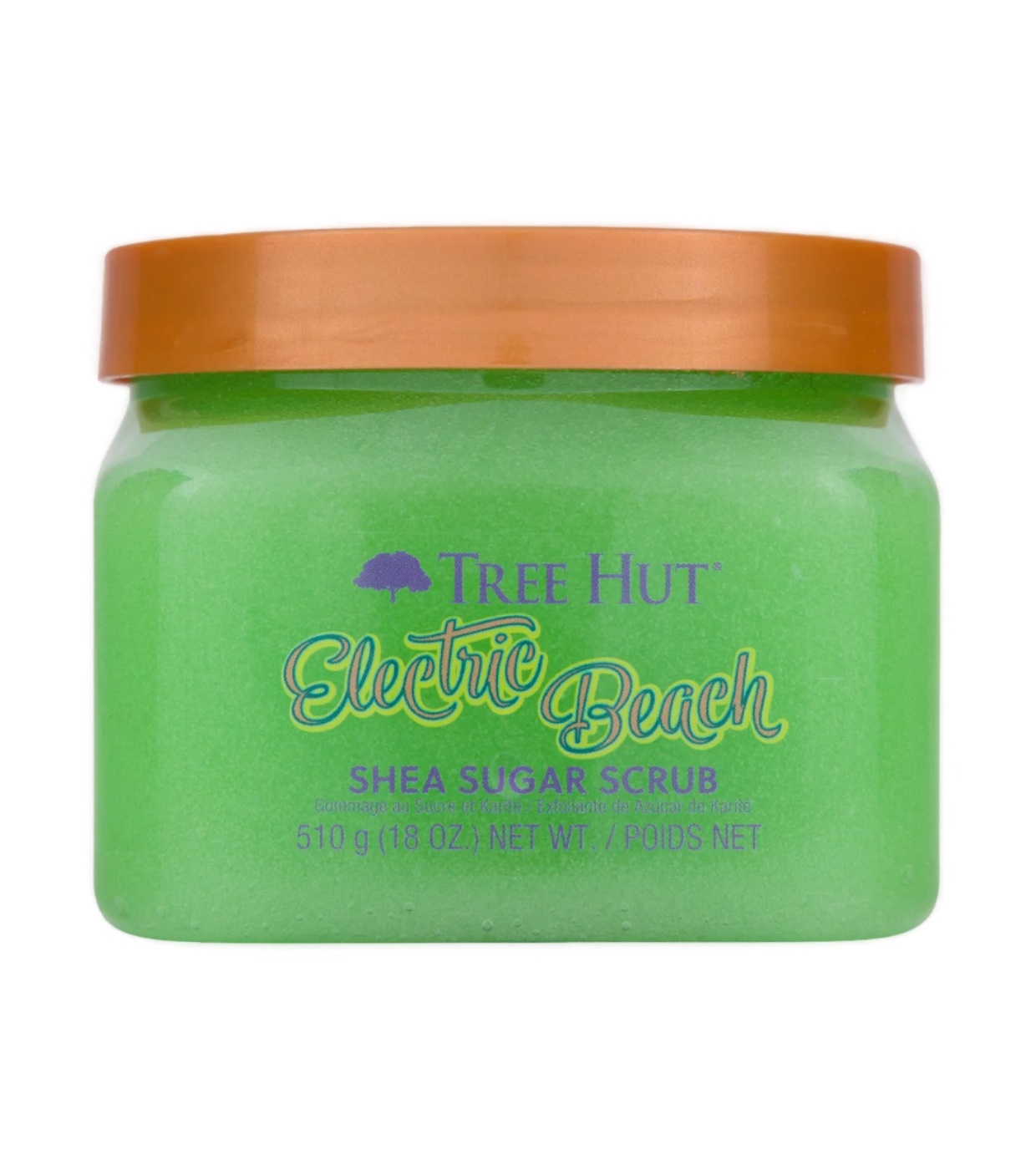 Verbessern Sie Ihre Duschroutine und zeigen Sie strahlende Haut mit dem Körperpeeling Shea Sugar Scrub von Tree Hut mit dem unwiderstehlichen Duft Electric Beach .