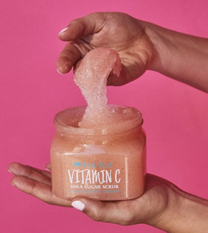 Hergestellt aus Zucker, Sheabutter, Vitamin C, Alpha-Hydroxysäure (AHA) und einer Vielzahl natürlicher Öle, darunter Grapefruit, Nachtkerze, Avocado, Macadamia, Süßmandel, Färberdistel und Orange.