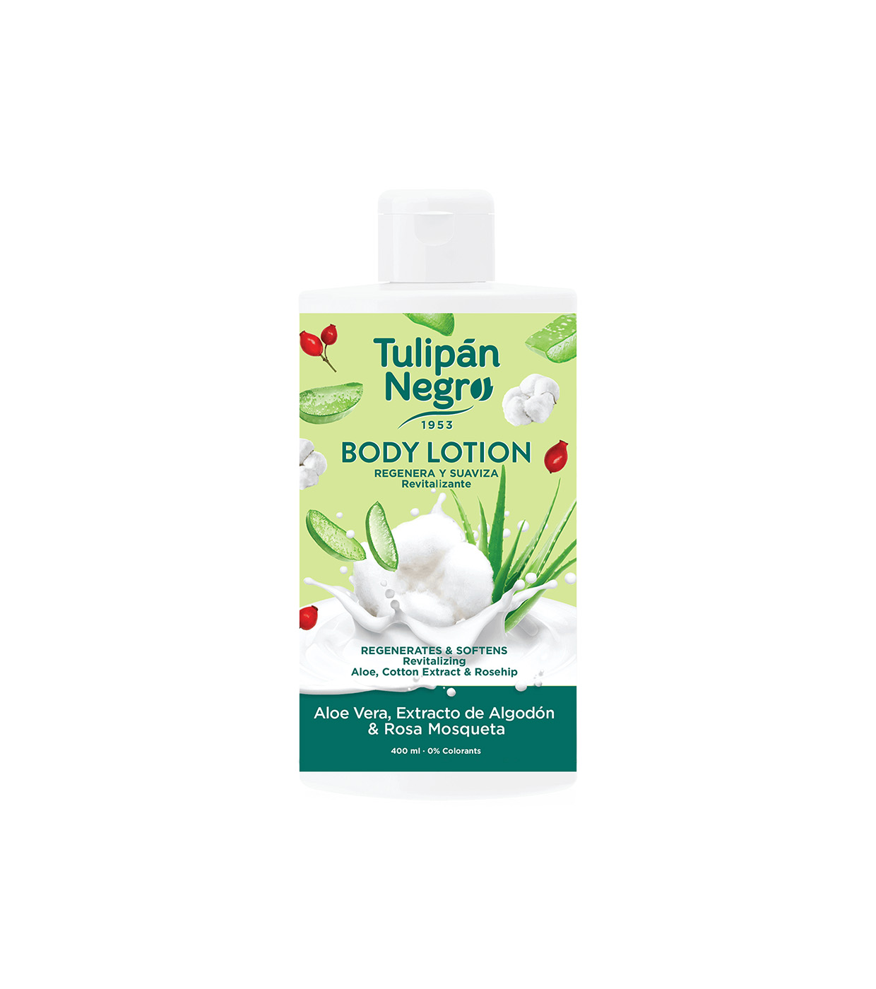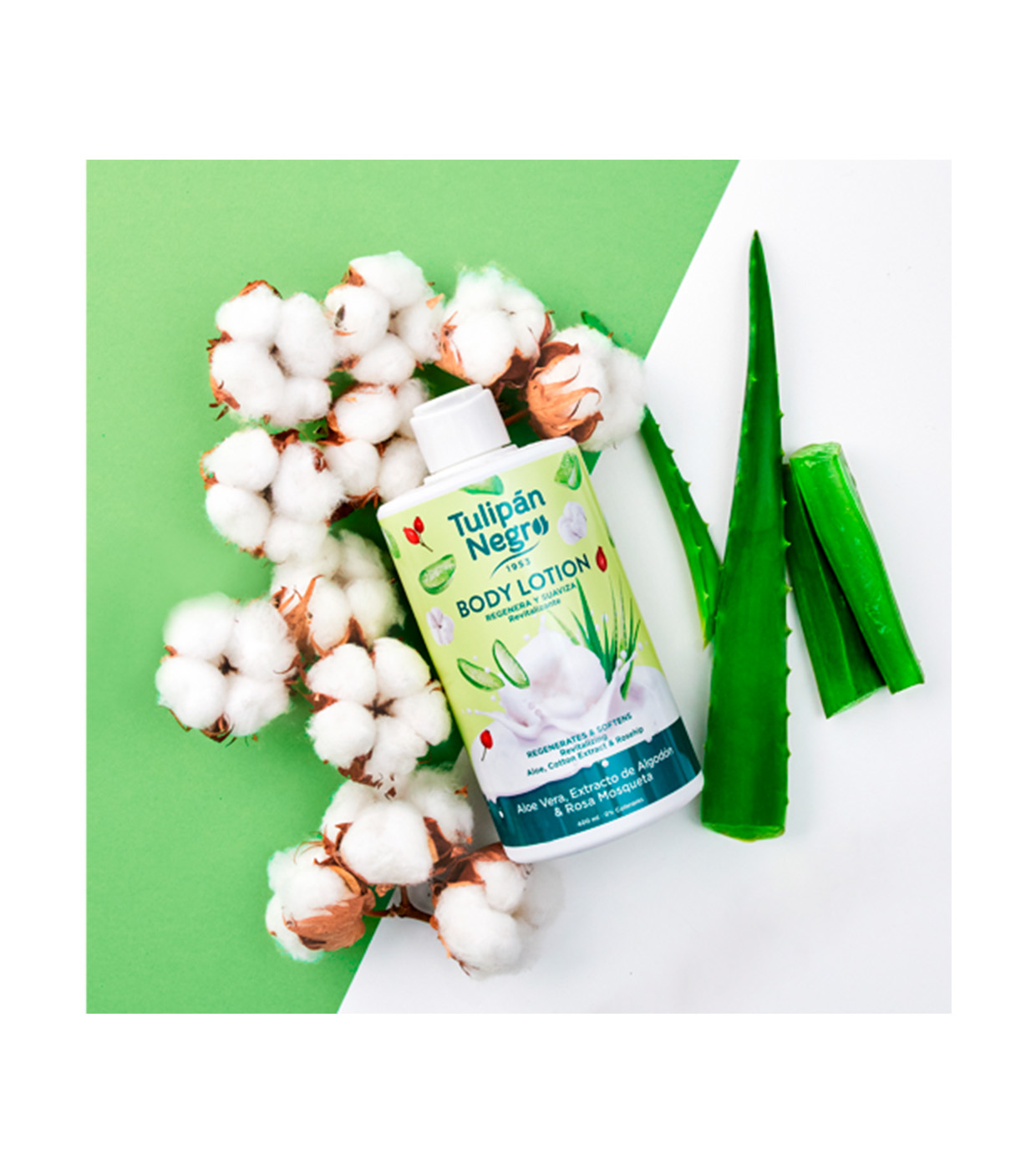 Körperlotion mit Aloe Vera, Baumwollextrakt und Hagebutte.