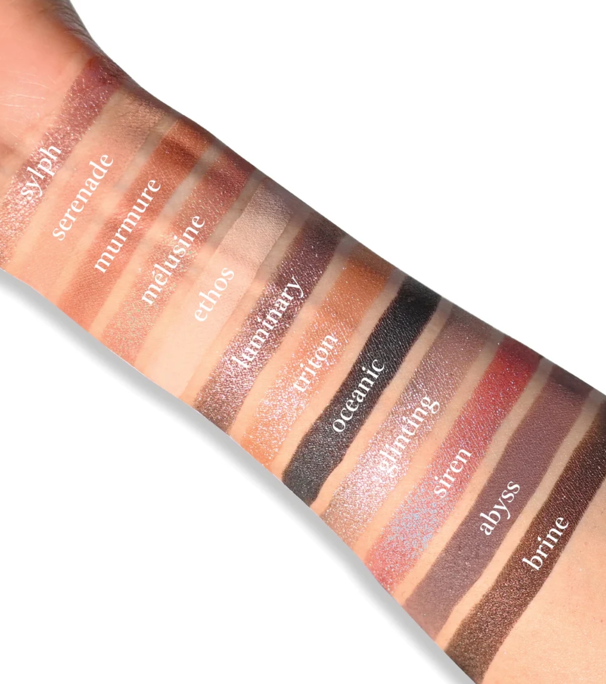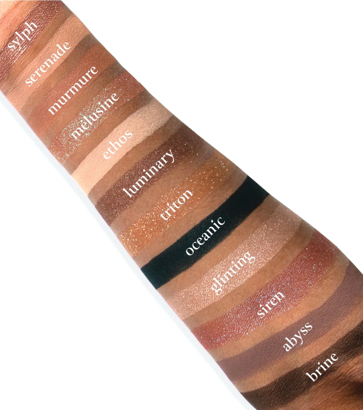 Shade 1 (Sylph): Synthetic Fluorphlogopite, Octyldodecyl Stearoyl Stearate, Talc, Zinc Stearate, Calcium Sodium Borosilicate. Shades 2 (Serenade), 3 (Murmure), 5 (Ethos): Talc, Octyldodecyl Stearoyl Stearate, Zinc Stearate. Shade 4 (Mélusine): Octyldodecyl Stearoyl Stearate, Silica, Synthetic Fluorphlogopite, Calcium Aluminum Borosilicate, Talc, Zinc Stearate. Shade 6 (Luminary): Calcium Sodium Borosilicate, Octyldodecyl Stearoyl Stearate, Talc, Zinc Stearate. Shade 7 (Triton): Calcium Sodium Borosilicate, Octyldodecyl Stearoyl Stearate, Dimethicone, Talc, Zinc Stearate. Shade 8 (Oceanic): Silica, Octyldodecyl Stearoyl Stearate, Calcium Aluminum Borosilicate, Zinc Stearate. Shade 9 (Glinting): Calcium Sodium Borosilicate, Octyldodecyl Stearoyl Stearate, Calcium Aluminum Borosilicate, Talc, Zinc Stearate, Synthetic Fluorphlogopite, Silica. Shade 10 (Siren): Talc, Silica, Octyldodecyl Stearoyl Stearate, Zinc Stearate. Shade 11 (Abyss): Talc, Silica, Octyldodecyl Stearoyl Stearate, Zinc Stearate. Shade 12 (Brine): Octyldodecyl Stearoyl Stearate, Talc, Zinc Stearate. (May Contain +/-: Mica CI 77019, Iron Oxides CI 77491/77499/77492, Titanium Dioxide CI 77891, Ultramarines Blue CI 77007, Manganese Violet CI 77742, Sodium Dehydroacetate, Yellow 5 Lake CI 19140, Red 40 Lake CI 16035, Aluminum CI 77000, Tin Oxide CI 77861, Aluminum Chlorohydrate, Carbon Black Cl 77266).