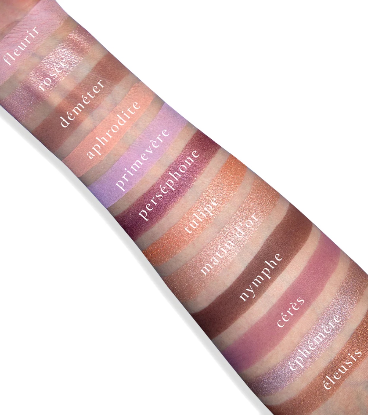Shades 1 (Fleurir), 5 (Primevère), 9 (Nymphe), 10 (Cérès): Talc, Octyldodecyl Stearoyl Stearate, Zinc Stearate. Shade 2 (Rosée): Calcium Sodium Borosilicate, Octyldodecyl Stearoyl Stearate, Talc. Shade 3 (Déméter): Talc, Octyldodecyl Stearoyl Stearate, Silica. Shade 4 (Aphrodite): Talc, Zinc Stearate, Octyldodecyl Stearoyl Stearate. Shade 6 (Perséphone): Octyldodecyl Stearoyl Stearate, Talc, Zinc Stearate. Shade 7 (Tulipe): Octyldodecyl Stearoyl Stearate, Synthetic Fluorphlogopite, Talc. Shade 8 (Matin D'or): Synthetic Fluorphlogopite, Talc, Octyldodecyl Stearoyl Stearate. Shades 11 (Éphémère), 12 (Éleusis): Calcium Sodium Borosilicate, Octyldodecyl Stearoyl Stearate, Talc. (May Contain +/- Aluminum CI 77000, Blue 1 Lake CI 42090, Carmine CI 75470, Ferric Ferrocyanide CI 77510, Iron Oxides CI 77491/77492/77499, Manganese Violet CI 77742, Mica CI 77019, Red 40 CI 16035).