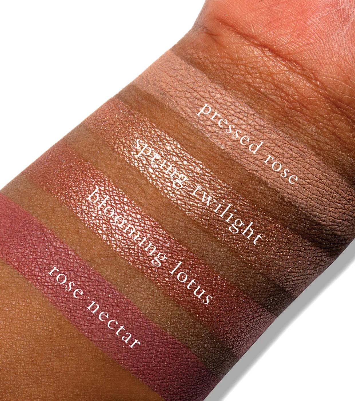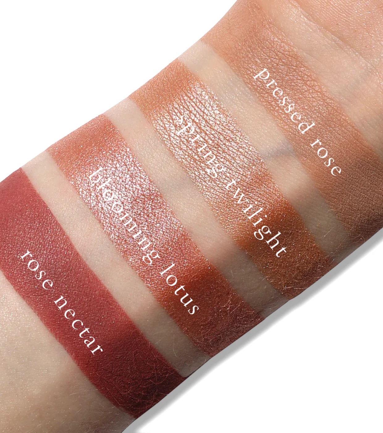 Shades 1 (Pressed Rose), 4 (Rose Nectar): Talc, Octyldodecyl Stearoyl Stearate, Zinc Stearate.