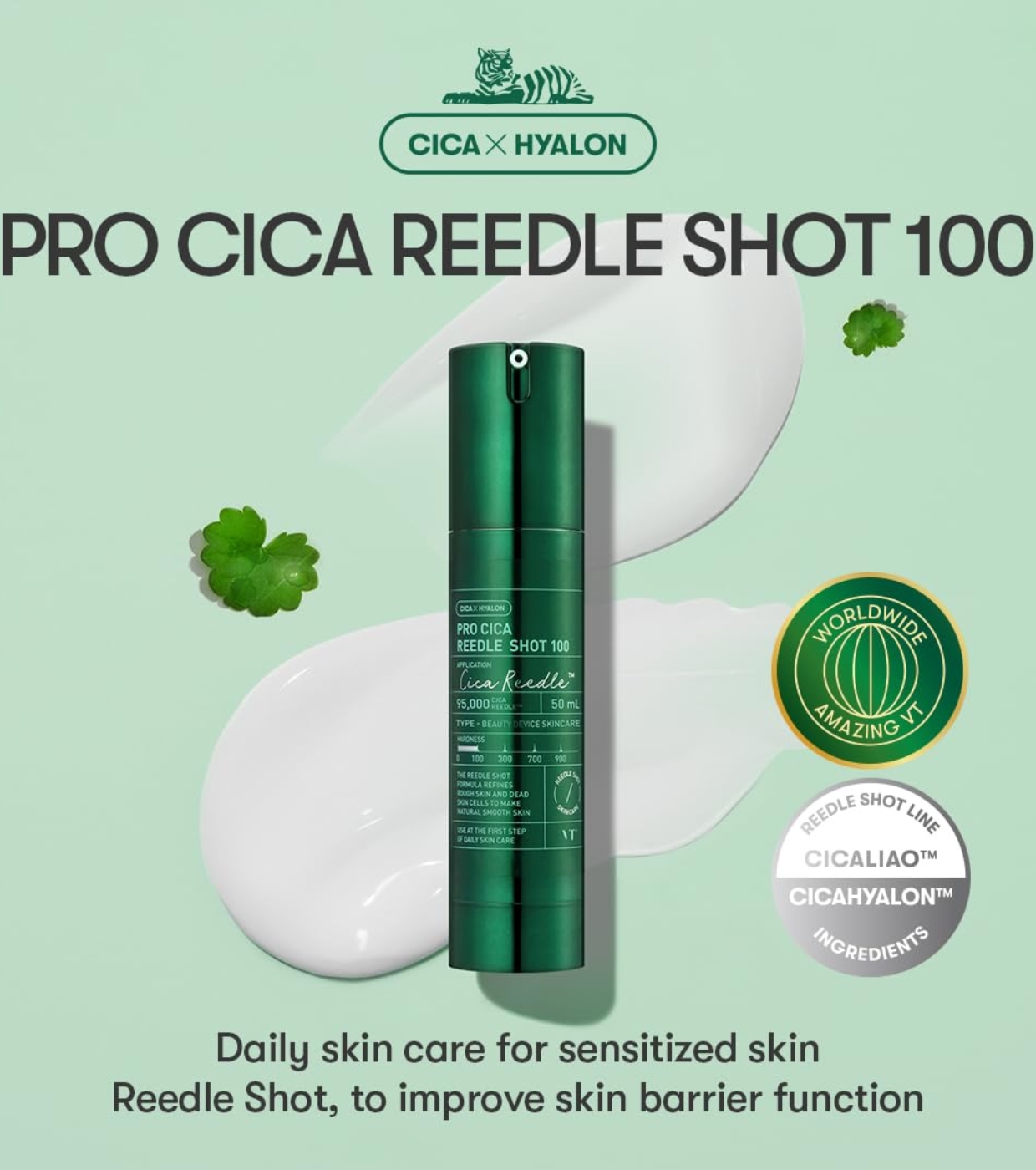 Das revolutionäre beruhigende Serum Pro Cica Shot 100 von VT Cosmetics enthält fortschrittliche Inhaltsstoffe wie Cica reedle.