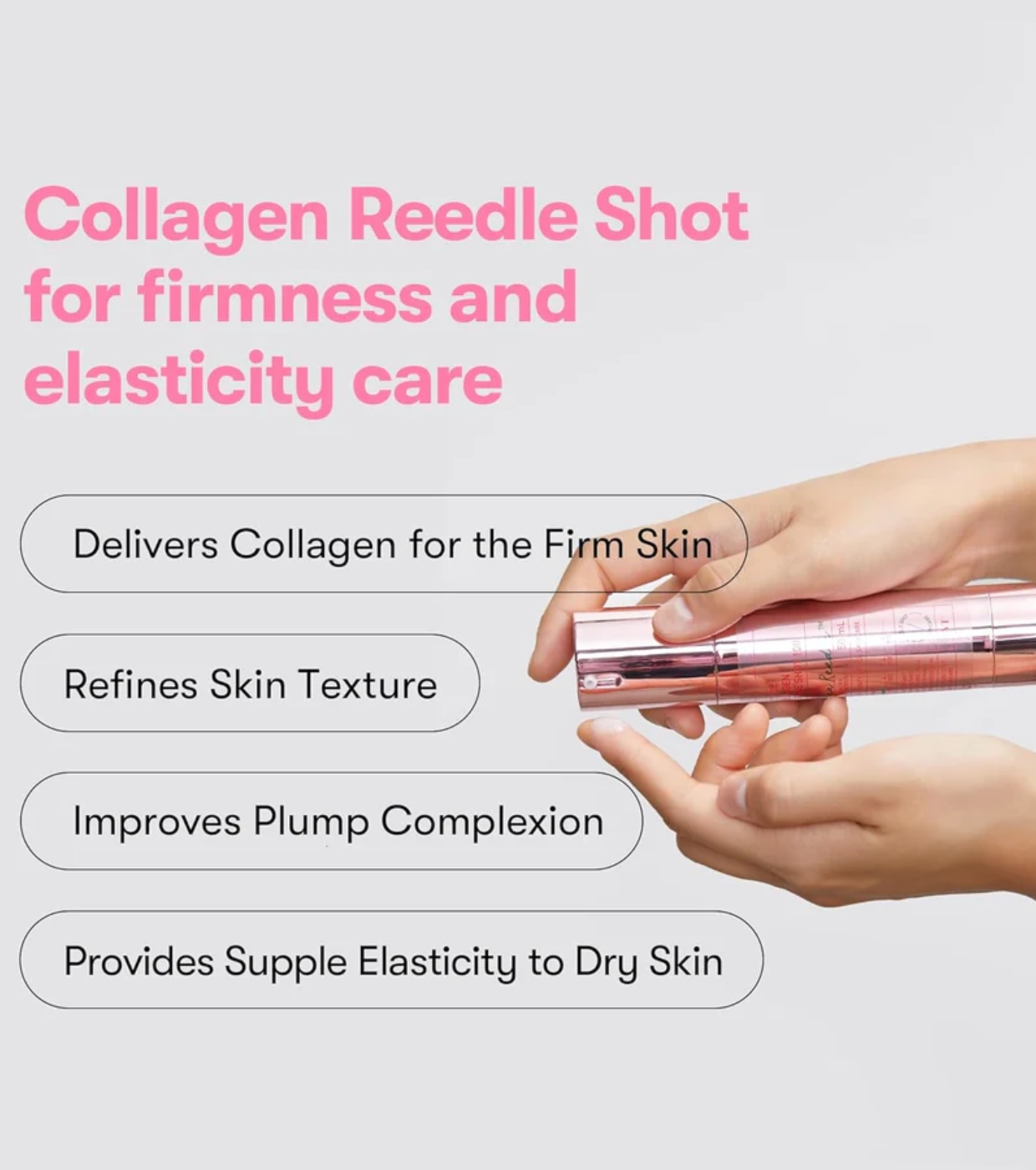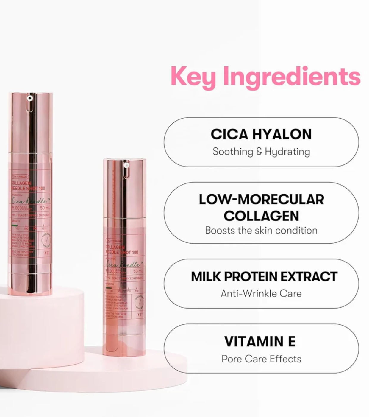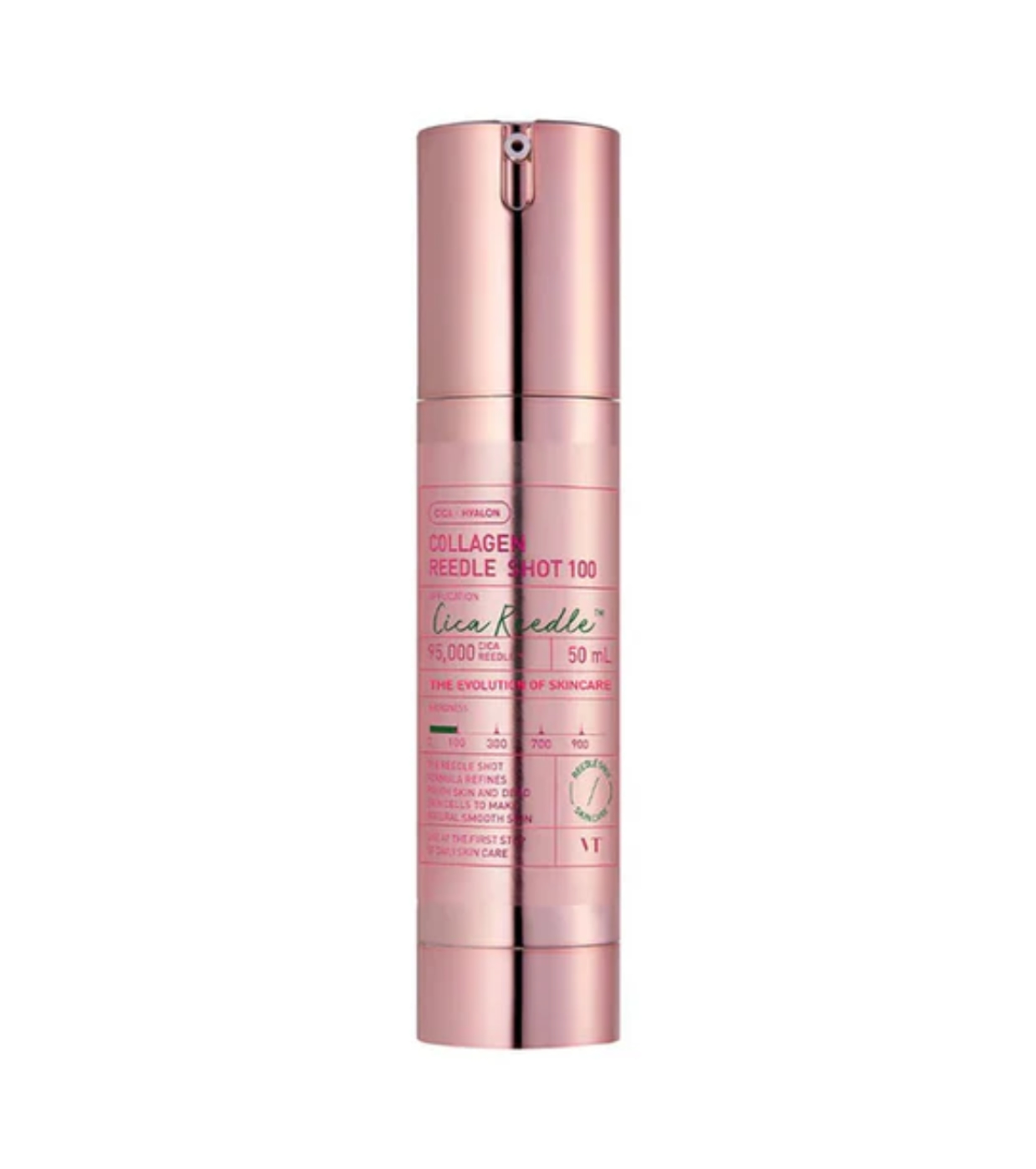 Verwandeln Sie Ihre Haut ab der ersten Anwendung mit dem innovativen Collagen Reedle Shot 100 von VT Cosmetics, einer fortschrittlichen Anti-Aging-Behandlung, die Mikronadeltechnologie mit einer leistungsstarken Formel kombiniert, die mit Kollagen mit niedrigem Molekulargewicht angereichert ist.