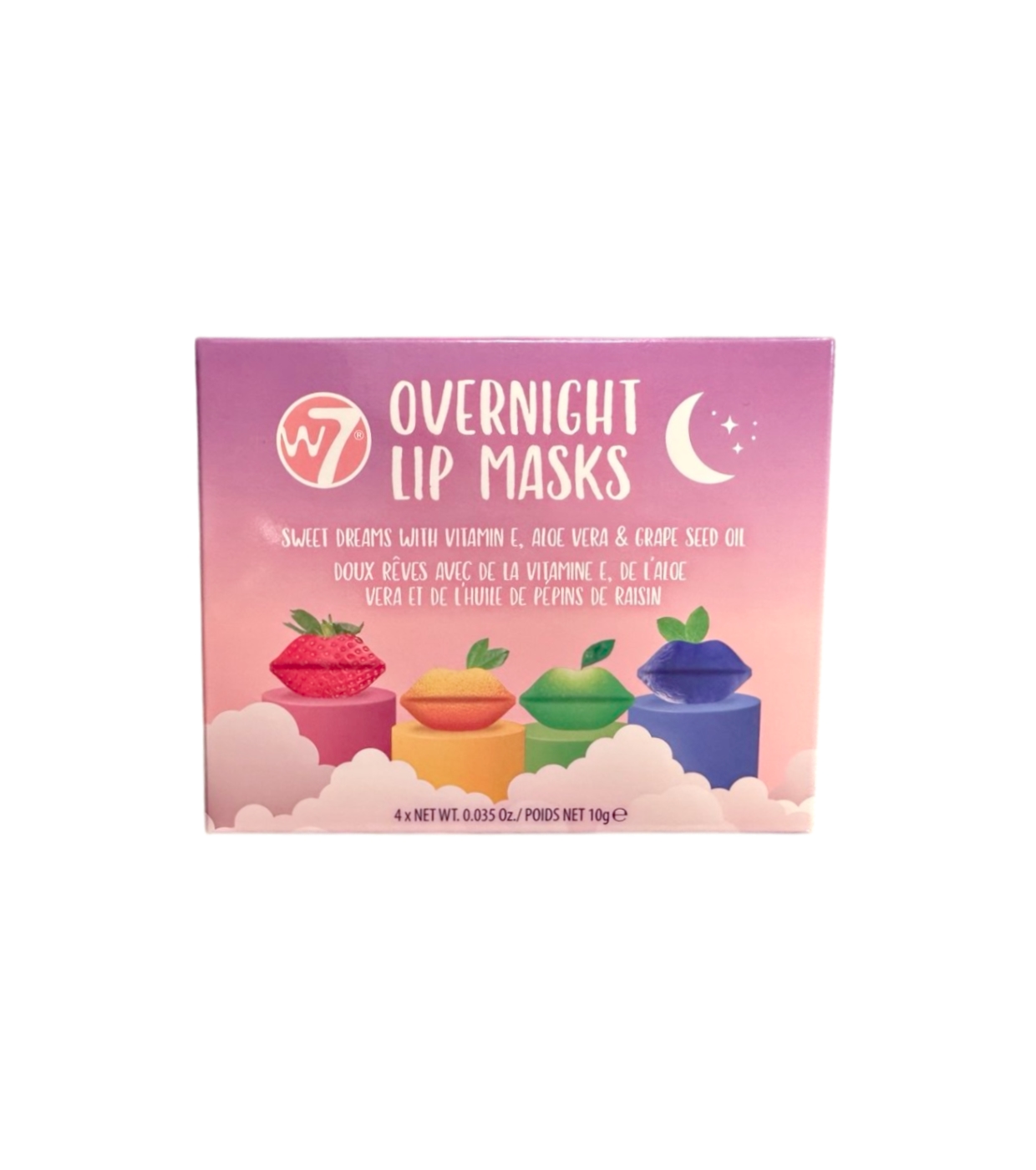 Verabschieden Sie sich von trockenen Lippen mit dem W7 Overnight Lip Masks Set , einer Packung mit 4 Nachtmasken, angereichert mit Vitamin E, Aloe Vera und Traubenkernöl.