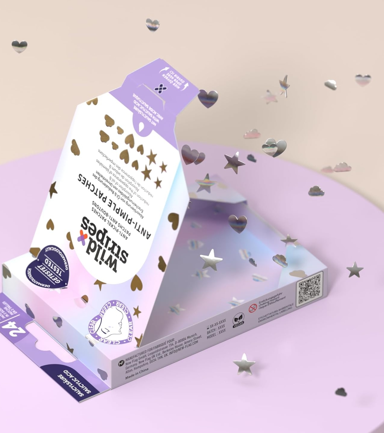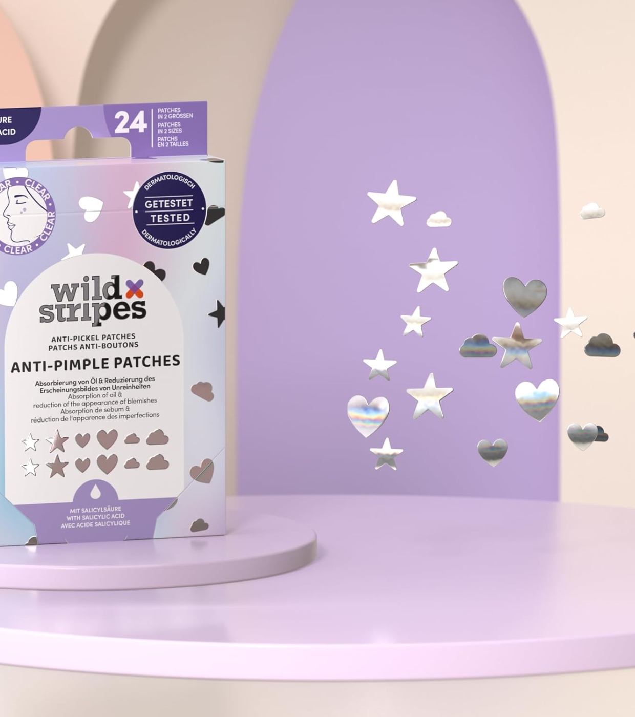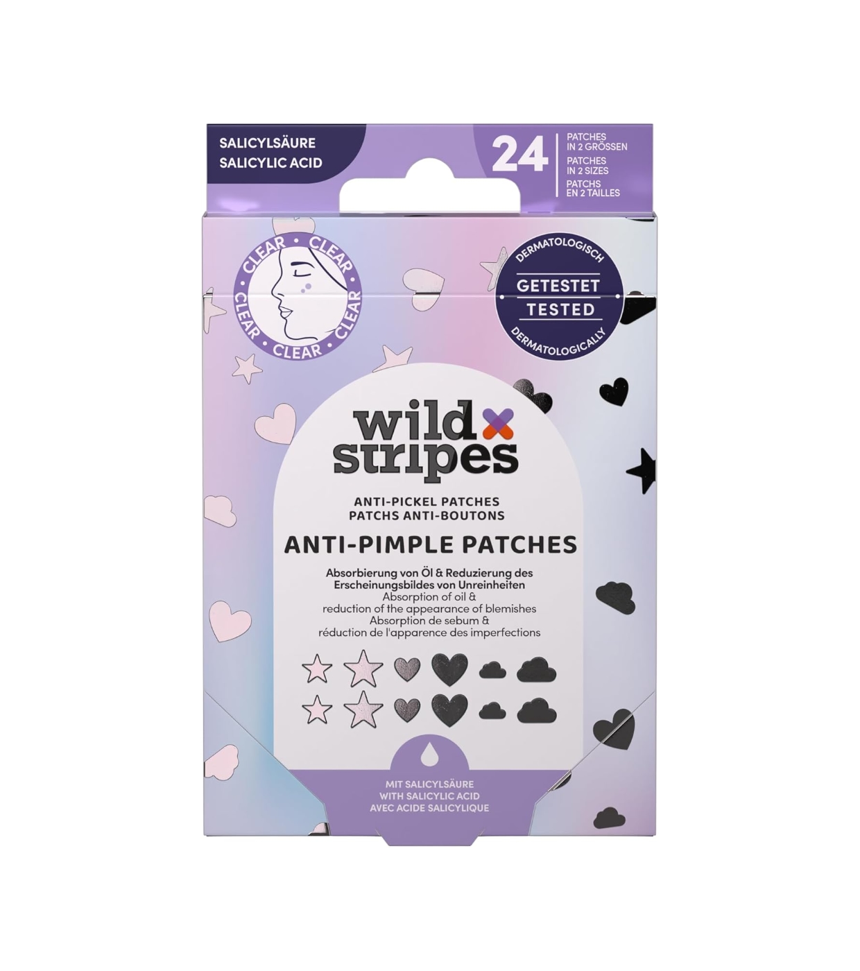 Verabschieden Sie sich stilvoll von Pickeln mit den Pickelpflastern Wild Stripes , Entwickelt, um die Haut zu beruhigen, zu schützen und ihre Regeneration zu fördern.