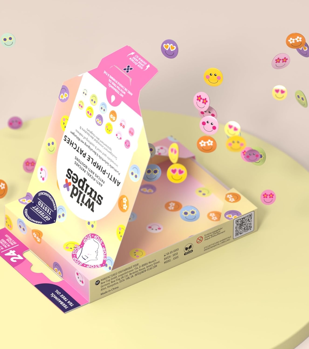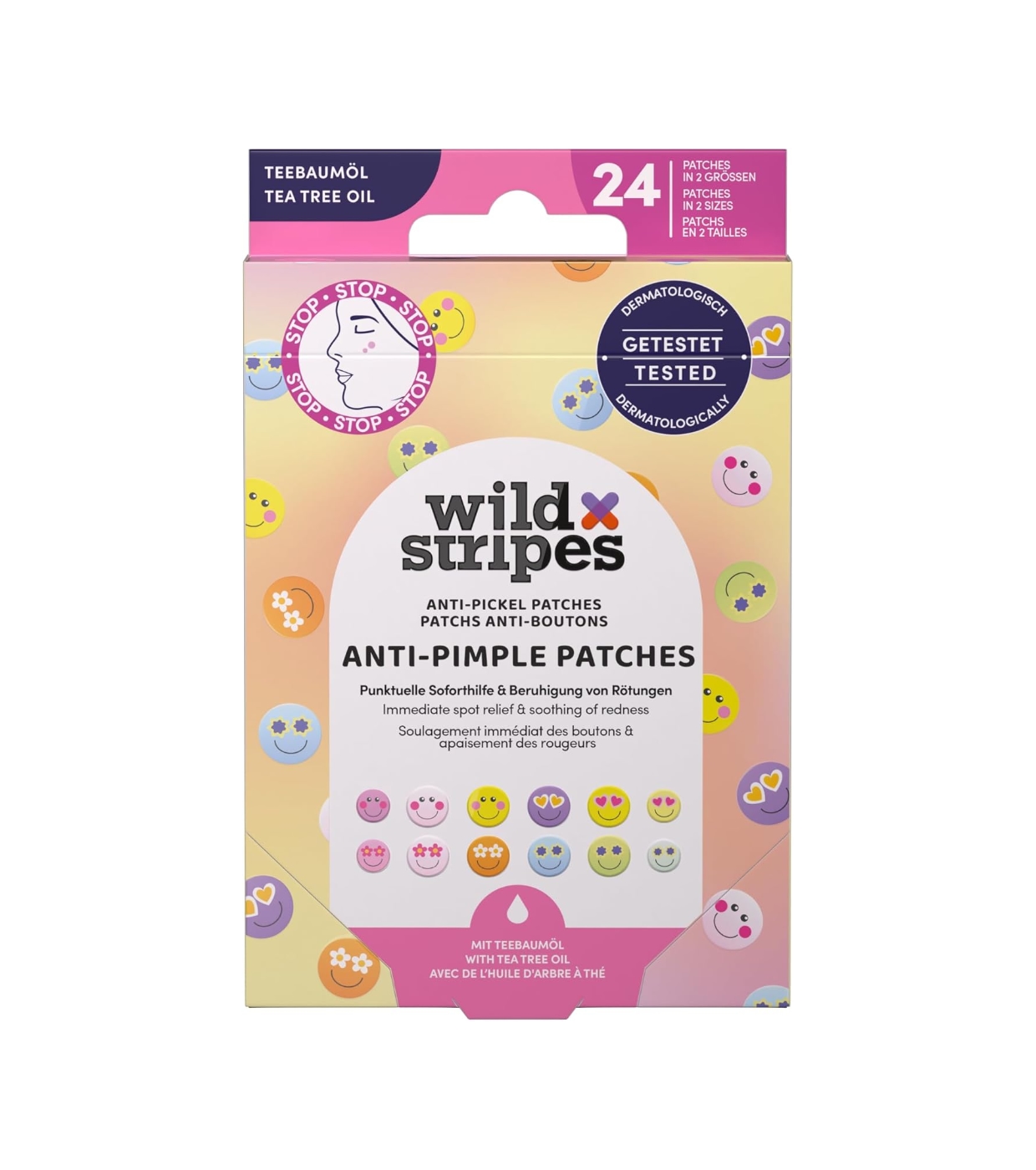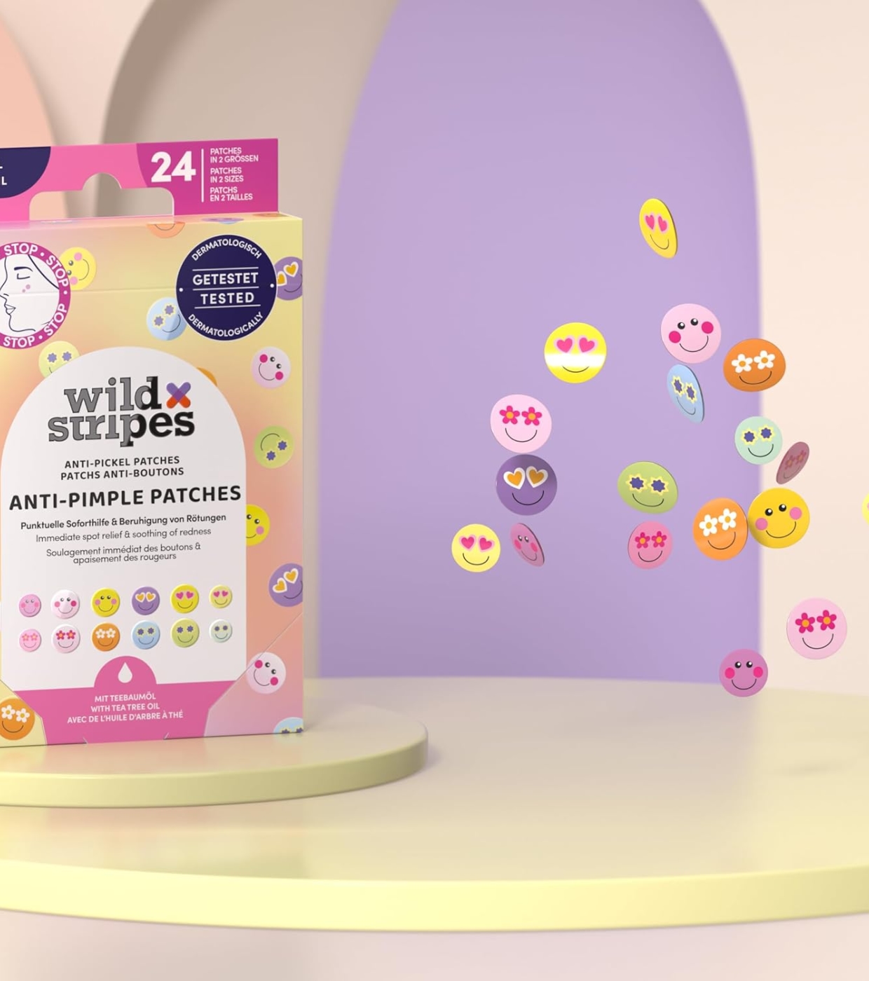 Verabschieden Sie sich stilvoll von Pickeln mit den Pickelpflastern Wild Stripes , Entwickelt, um die Haut zu beruhigen, zu schützen und ihre Regeneration zu fördern.