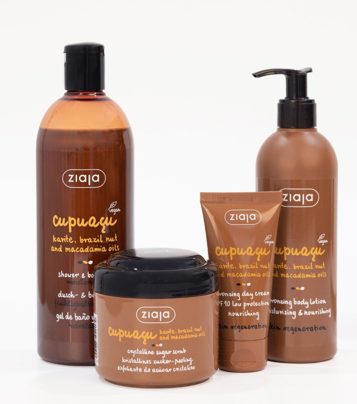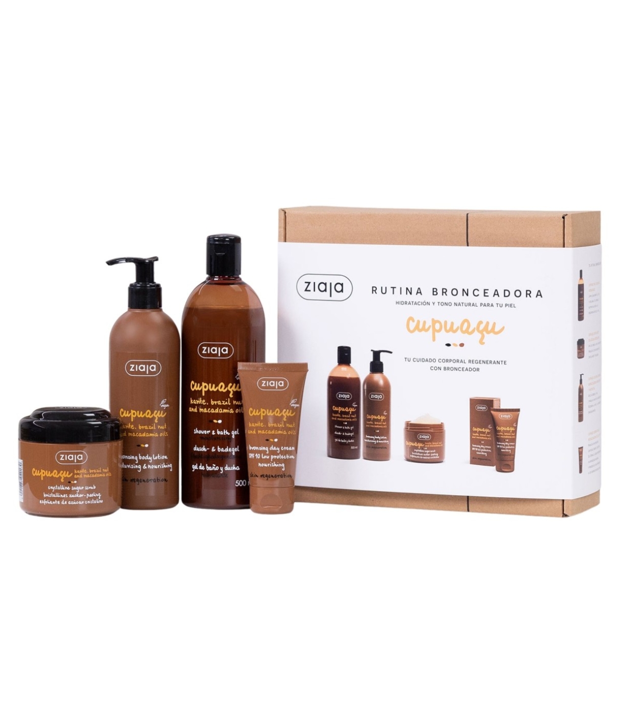 Das Cupuaçu Bräunungsroutine-Set von Ziaja vereint vier essentielle Körperpflegeprodukte, die die Haut mit Feuchtigkeit versorgen, regenerieren und ihre Struktur verbessern und gleichzeitig für eine natürliche und gleichmäßige Bräune im Gesicht und am Körper sorgen.