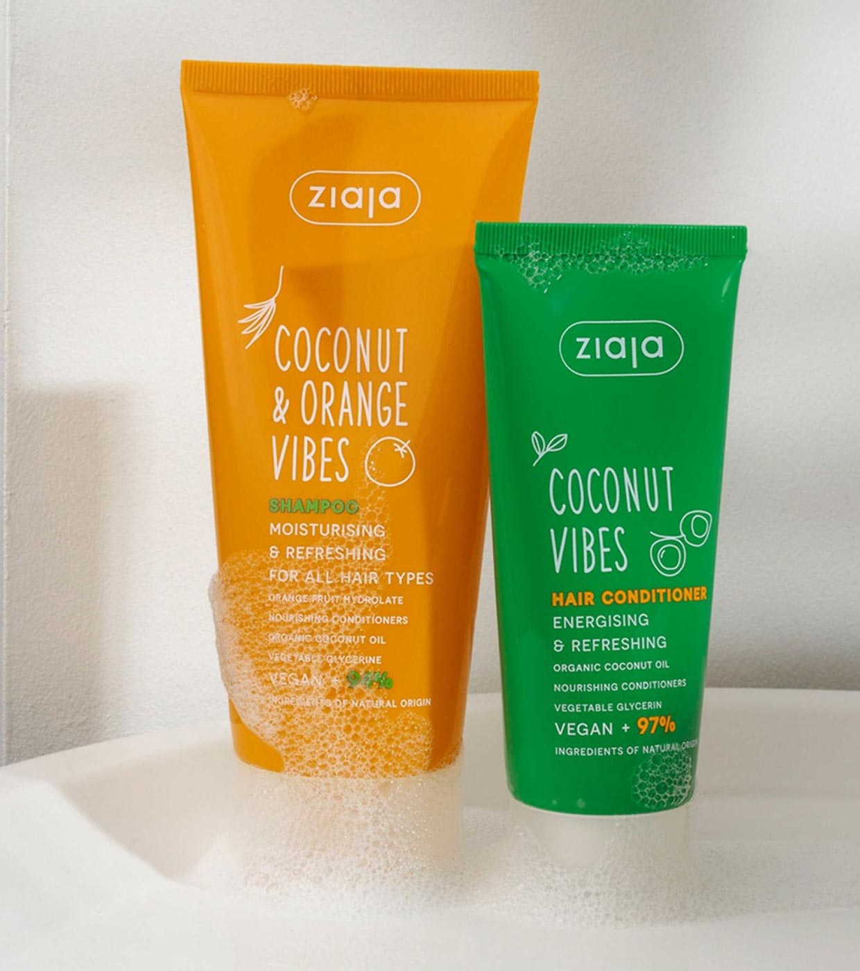 Feuchtigkeitsspendendes und erfrischendes Shampoo Coconut and Orange Vibes de Ziaja.
